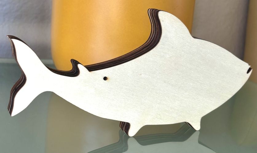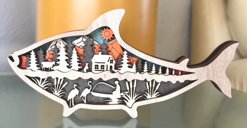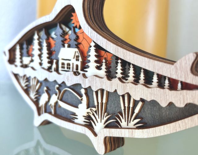 Inside are multilayers of laser-cut stained wood in natural wood, brownish gray, vibrant orange and sky blue. The color scheme is very attractive and has great contrast.