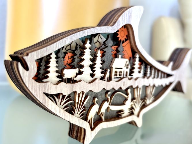 This is a very detailed 3D multilayered wooden diorama featuring a lake fish with charming scenes of a man in a rowboat fishing in a marsh (herons and cattails add great appeal) and a homestead scene featuring a house, pine tree grove, the dog and a grazing cow. A homey, picturesque environment!