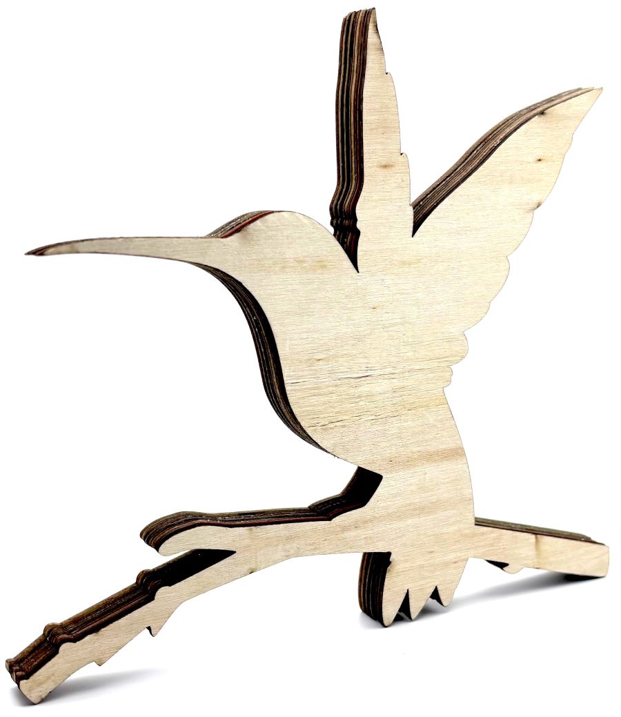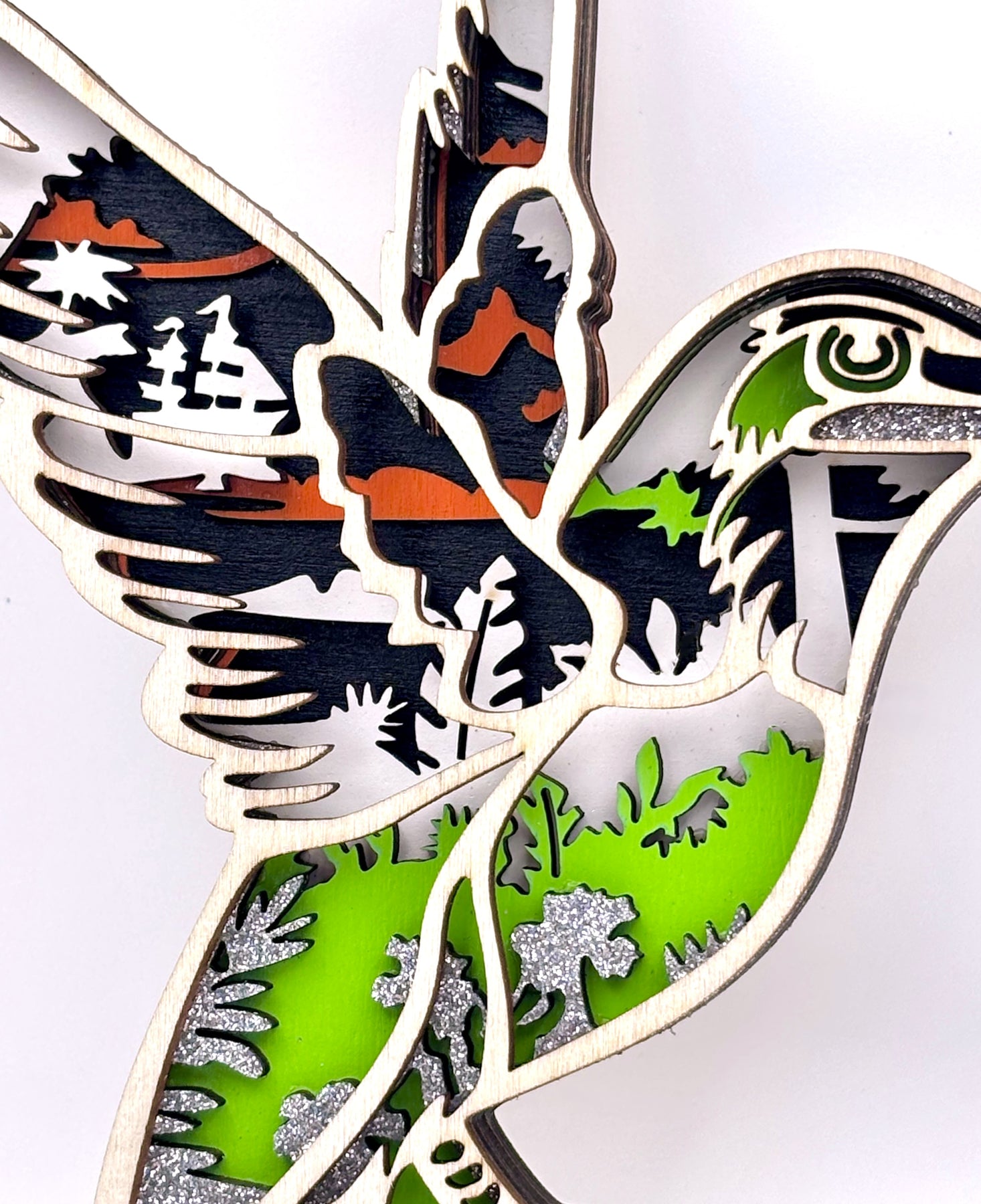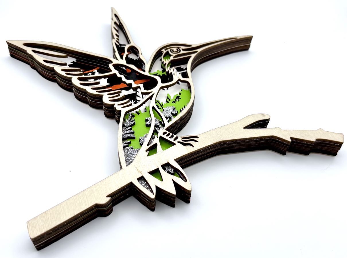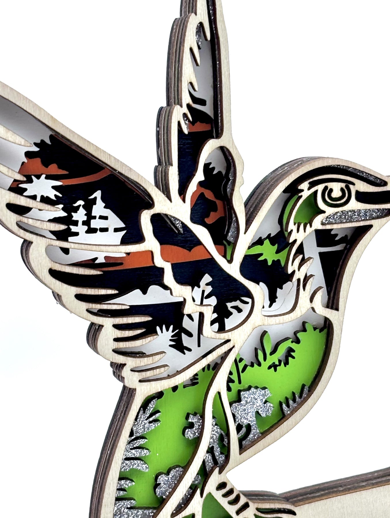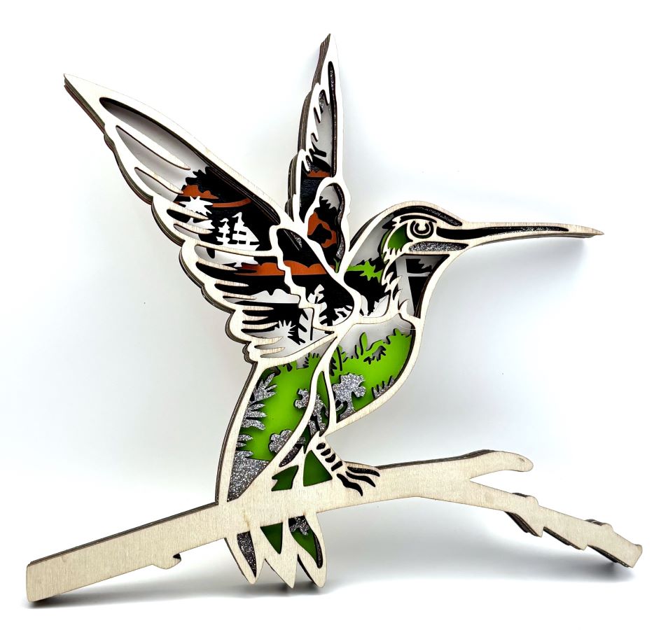 This beautifully crafted 3D wooden diorama showcases an exquisite tropical hummingbird. As the majority of hummingbird species are tropical, the scene inside showcases this environment. The intricate design captures the essence of the tropical habitat, with tropical leaves and bright green foliage and a ship with sails on the ocean. Vibrant colors of green and orange, with black, white and silver glitter paint make this piece 'pop'.