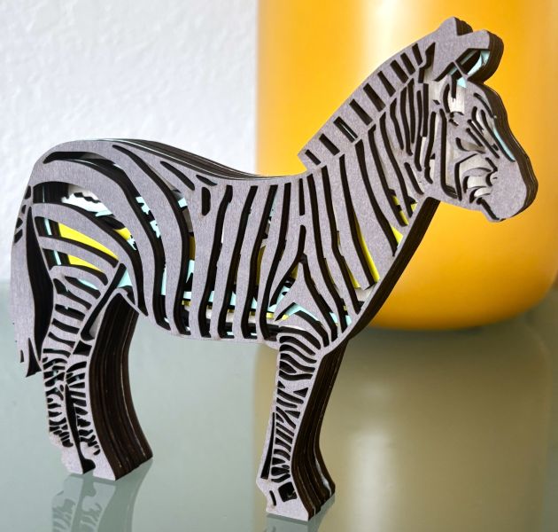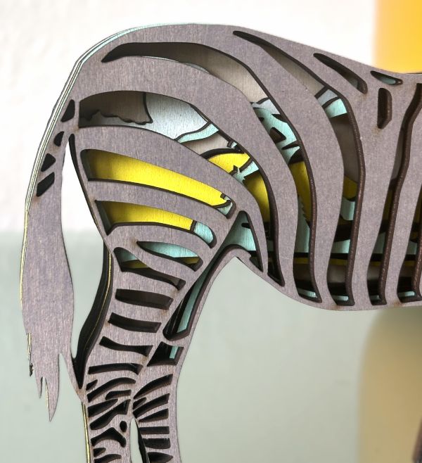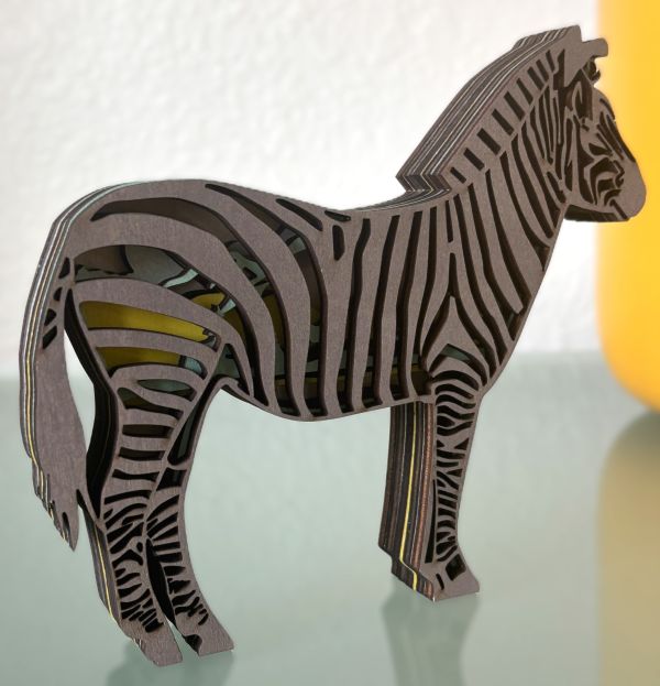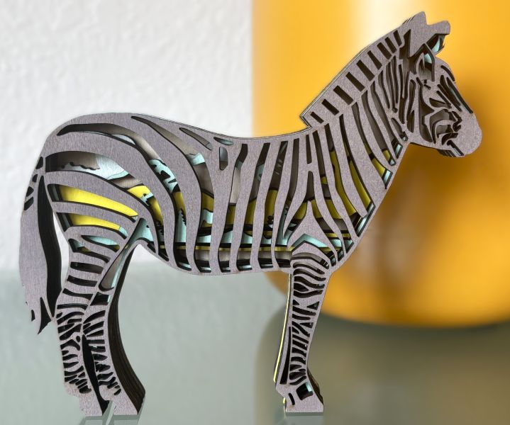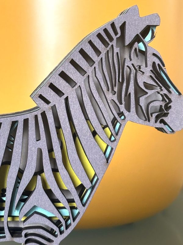 This unique diorama showcases a zebra with a more 'hidden' interior scene. Peek inside to discover vibrant greenish-yellow, light blue, and teal hues against natural wood, creating an abstract interpretation of the African tundra complete with a sun silhouette. The zebra's rich dark brownish-black stain creates a striking contrast with the colorful interior world, making this piece a delightful surprise for the eyes!