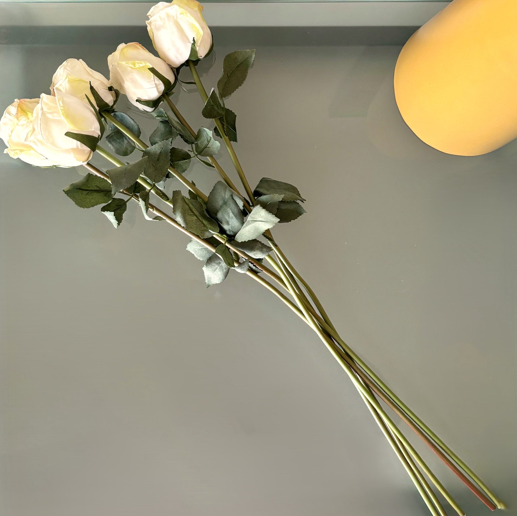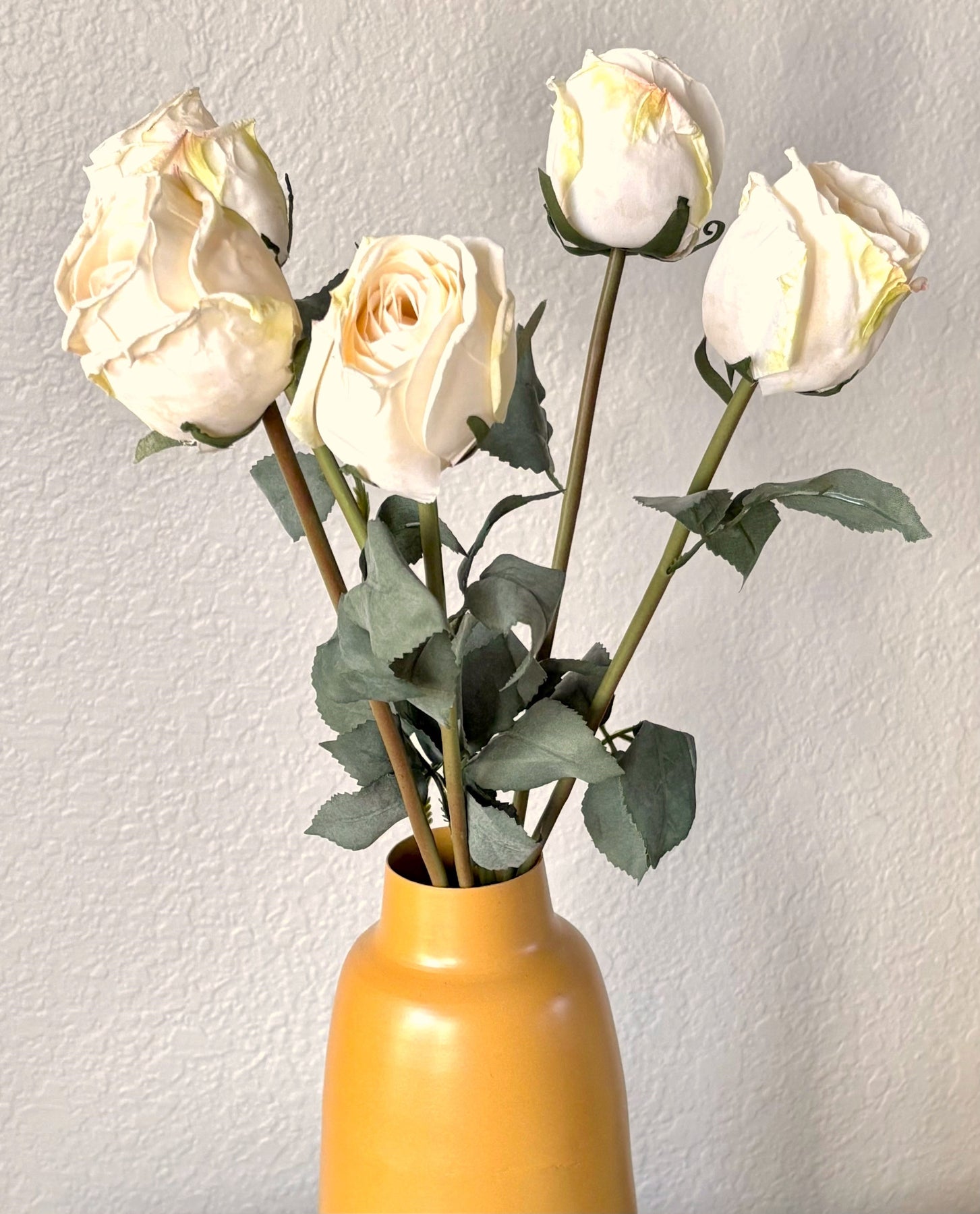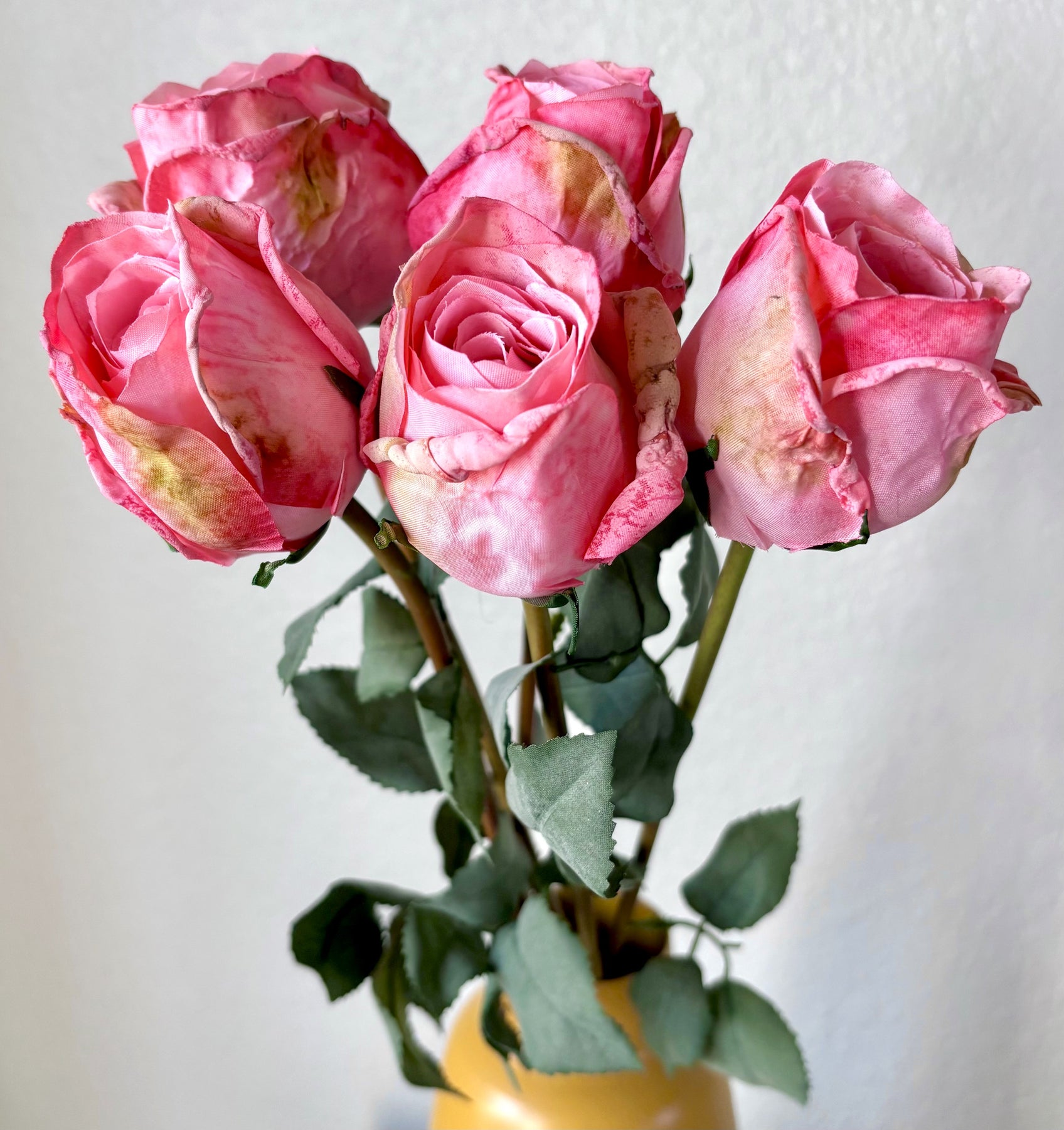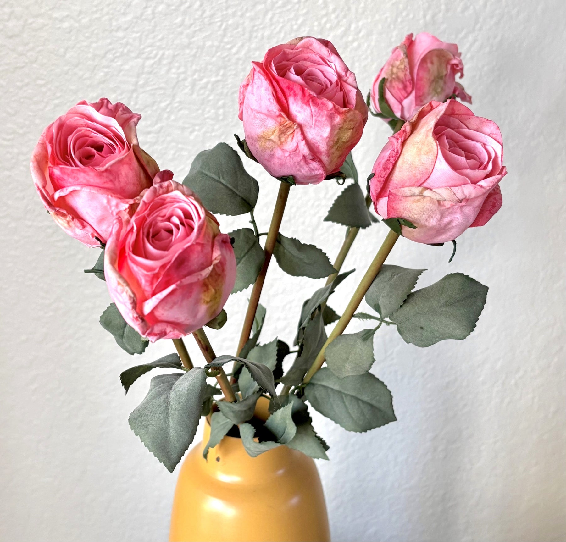 Each fabric rose has a "burnt edge" giving the outside petals an even more realistic look. These beautiful roses come in a bundle of five stems. Three colors are available: Deep Red Pink, Creamy White and Pink. The multi-tonal colors have great dimension, adding to the overall realistic beauty.