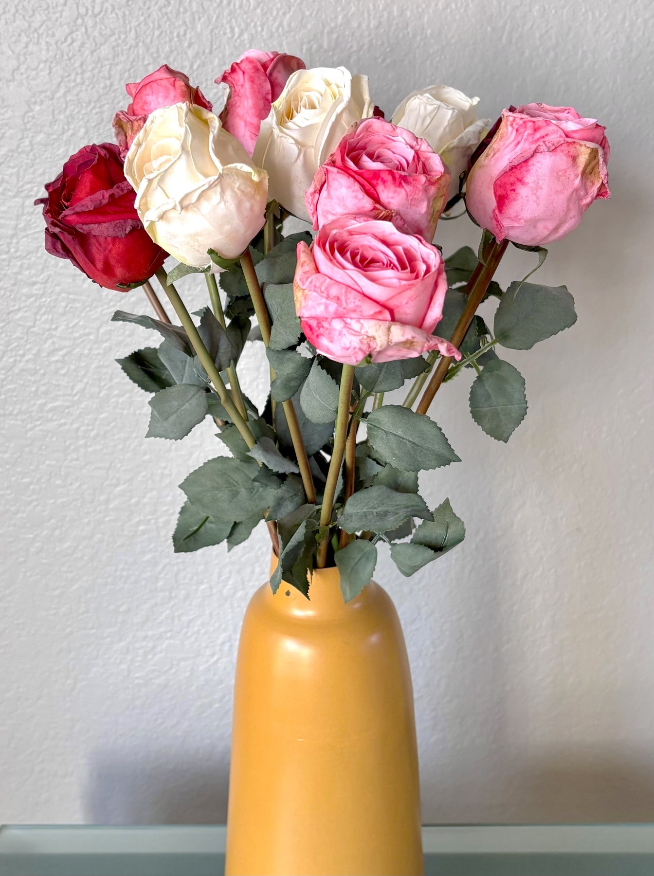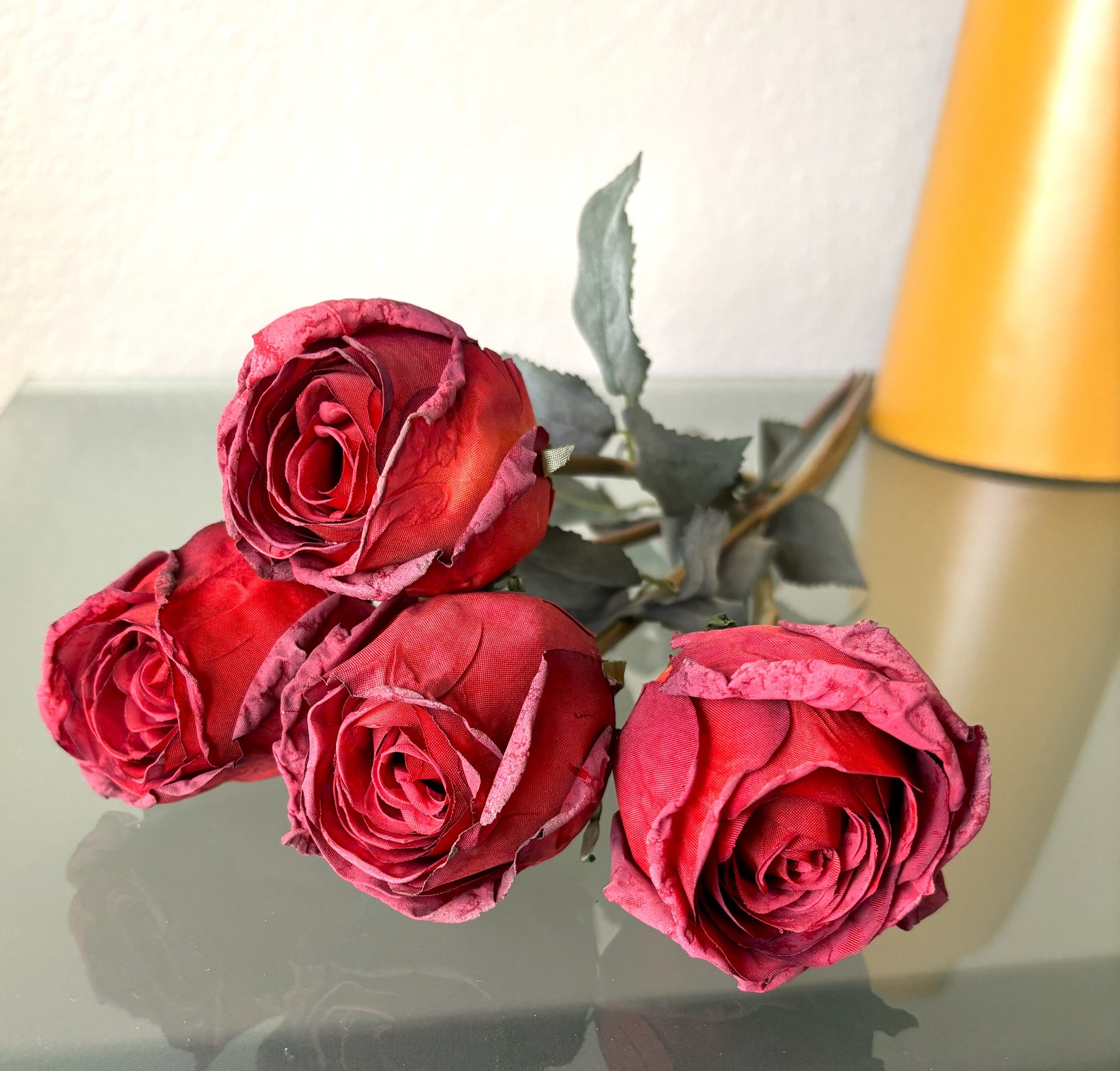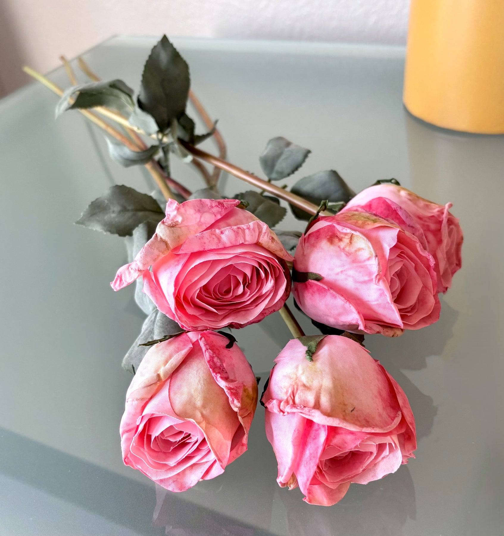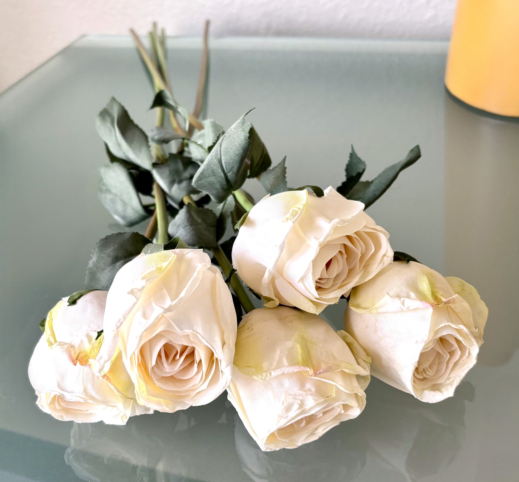Each fabric rose has a "burnt edge" giving the outside petals an even more realistic look. These beautiful roses come in a bundle of five stems. Three colors are available: Deep Red Pink, Creamy White and Pink. The multi-tonal colors have great dimension, adding to the overall realistic beauty.