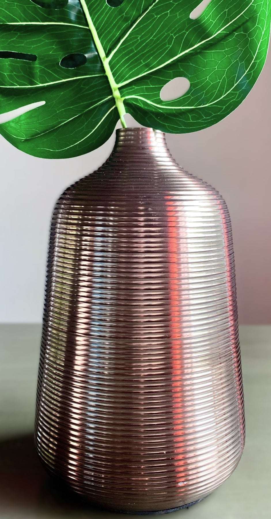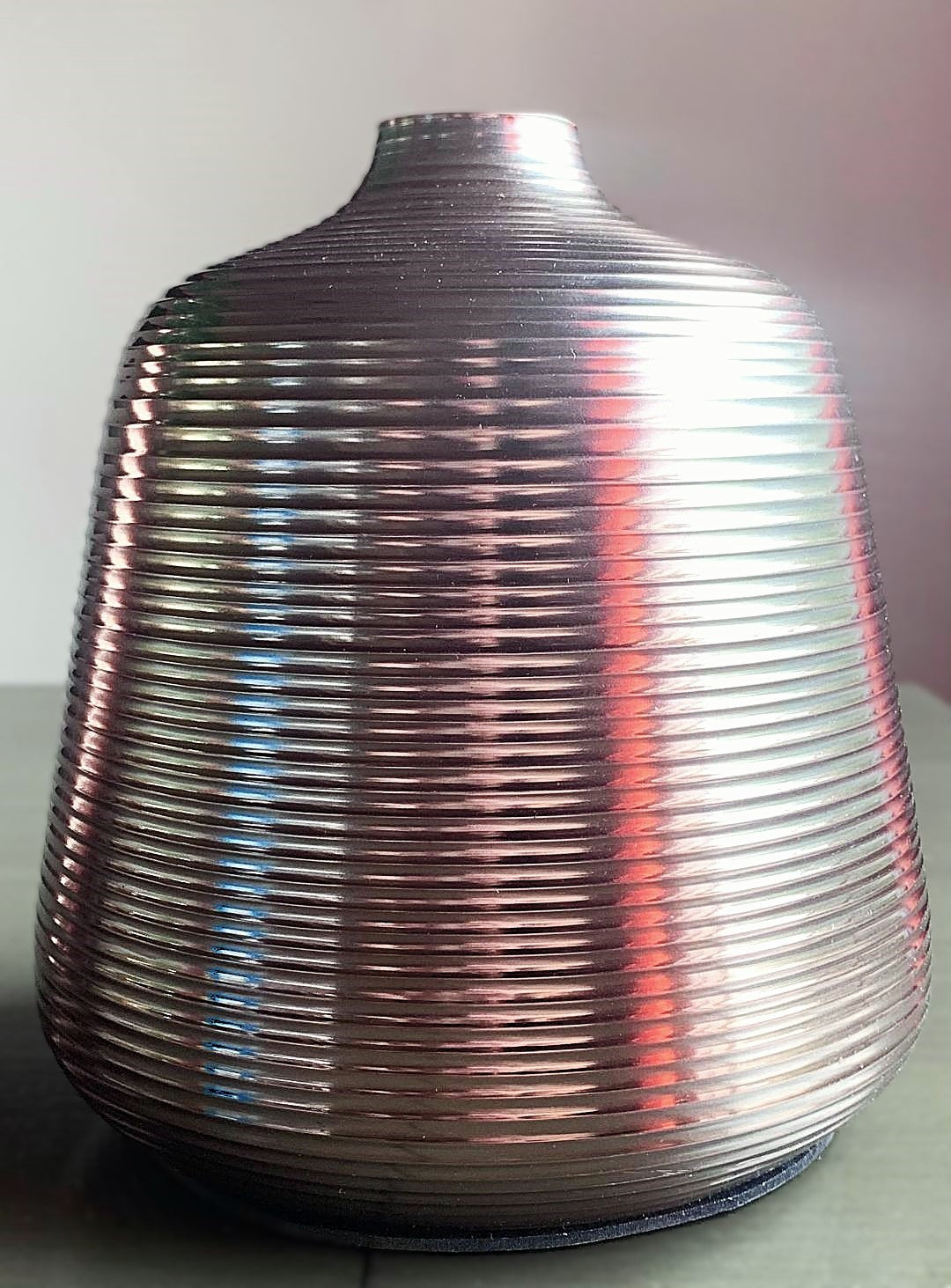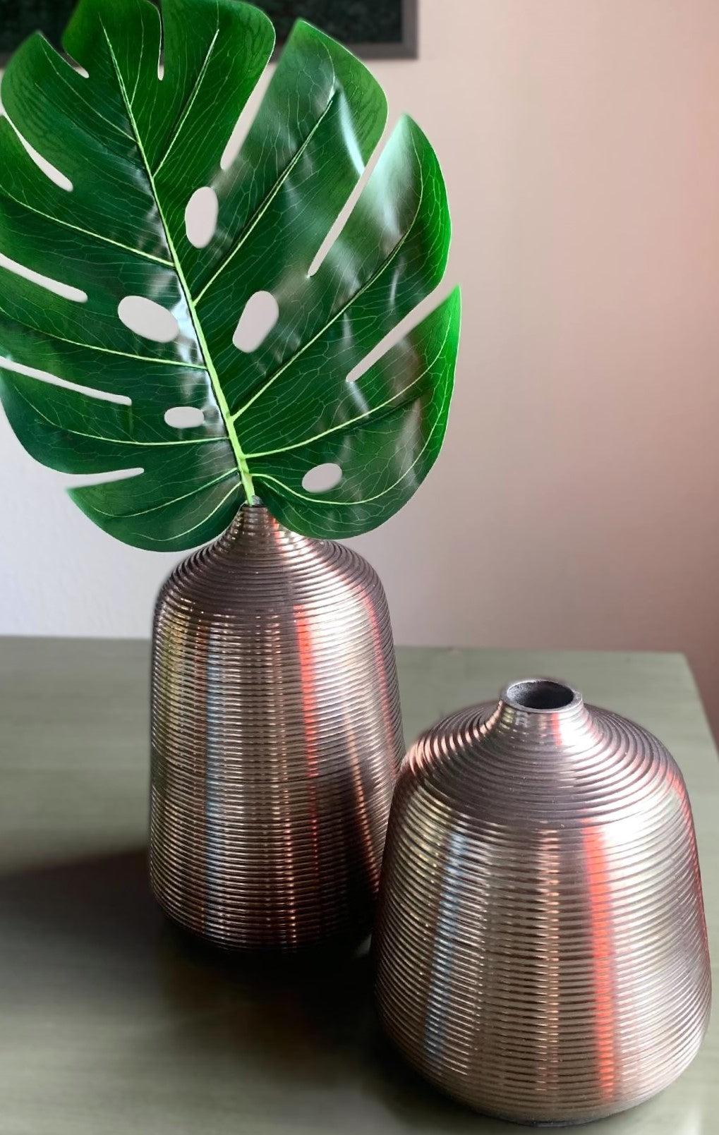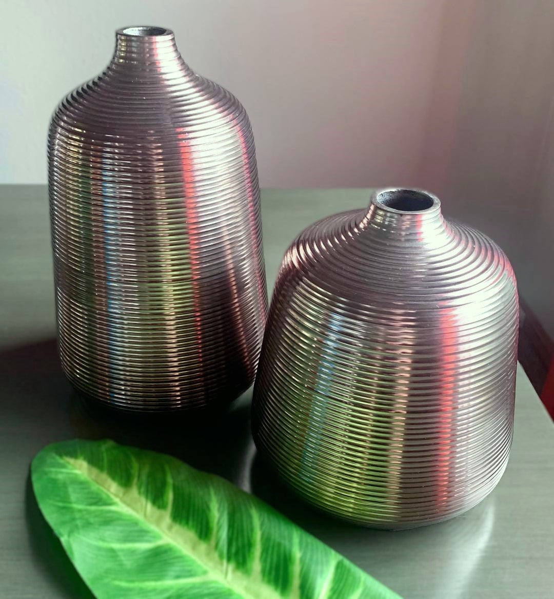 These are gorgeous, heavyweight vases. Made of lacquered aluminum with an attractive ribbed design. The vendor technically calls the finish of these "black", however they really change tones with lighting. Sometimes they appear to have a black tone, sometimes it leans to being more silver and other times they have a warm, copper tone. Needless to say, they are beautiful and the color tone will fit in well anywhere.