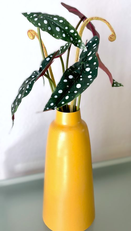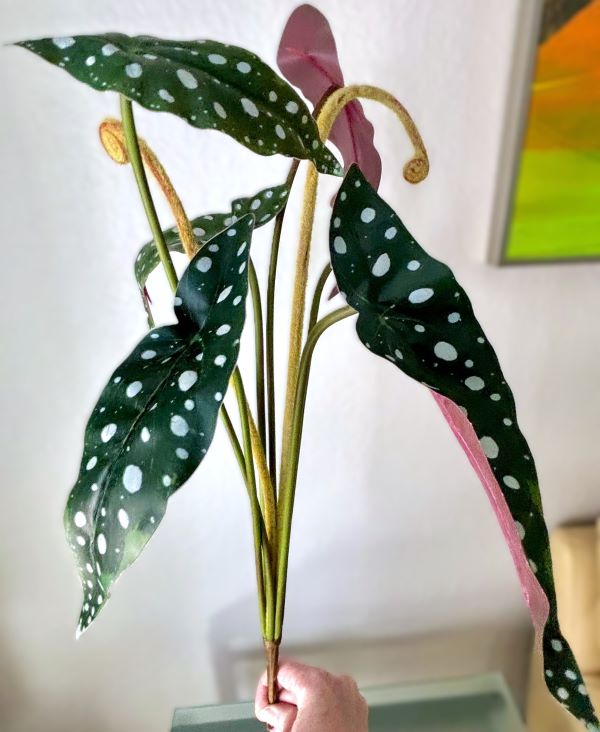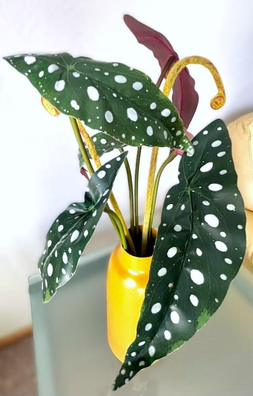 Begonia Maculata (Spotted Begonia) is a exquisite plant and we are happy to be able to offer it as an artificial. No worrying about not properly caring for it! This plant features large, angel wing-shaped leaves that are dark green and adorned with bright silvery spots. The undersides of the leaves are a rich red, adding to the plant's dramatic flair.