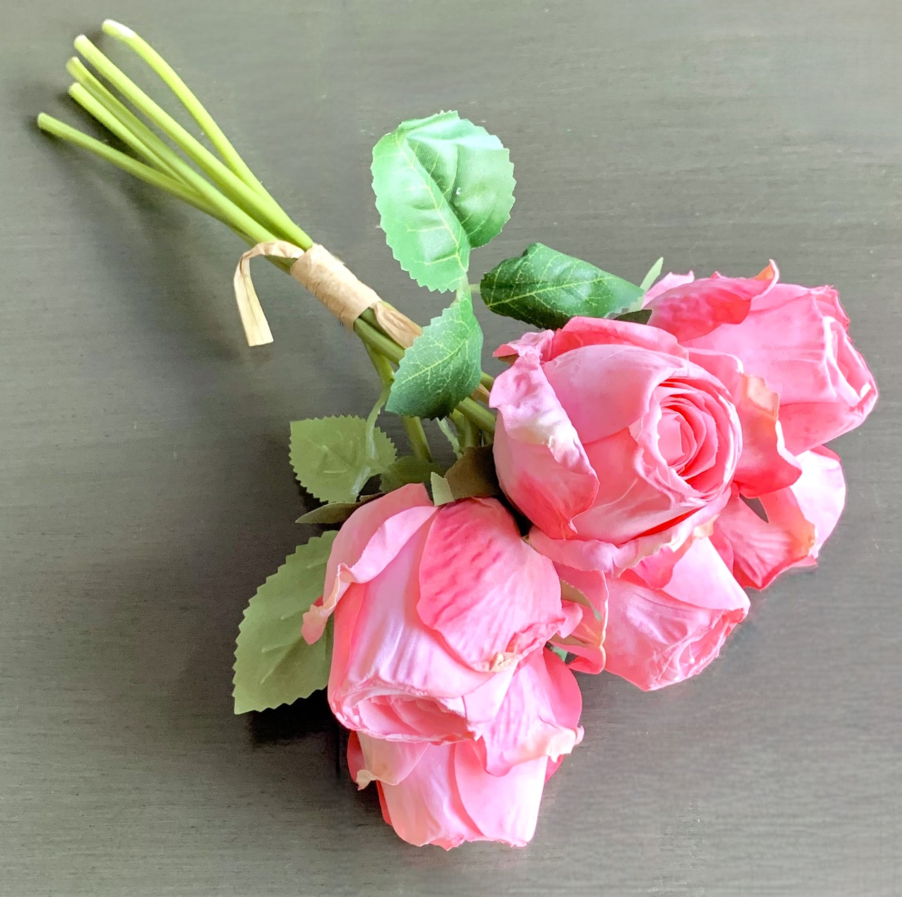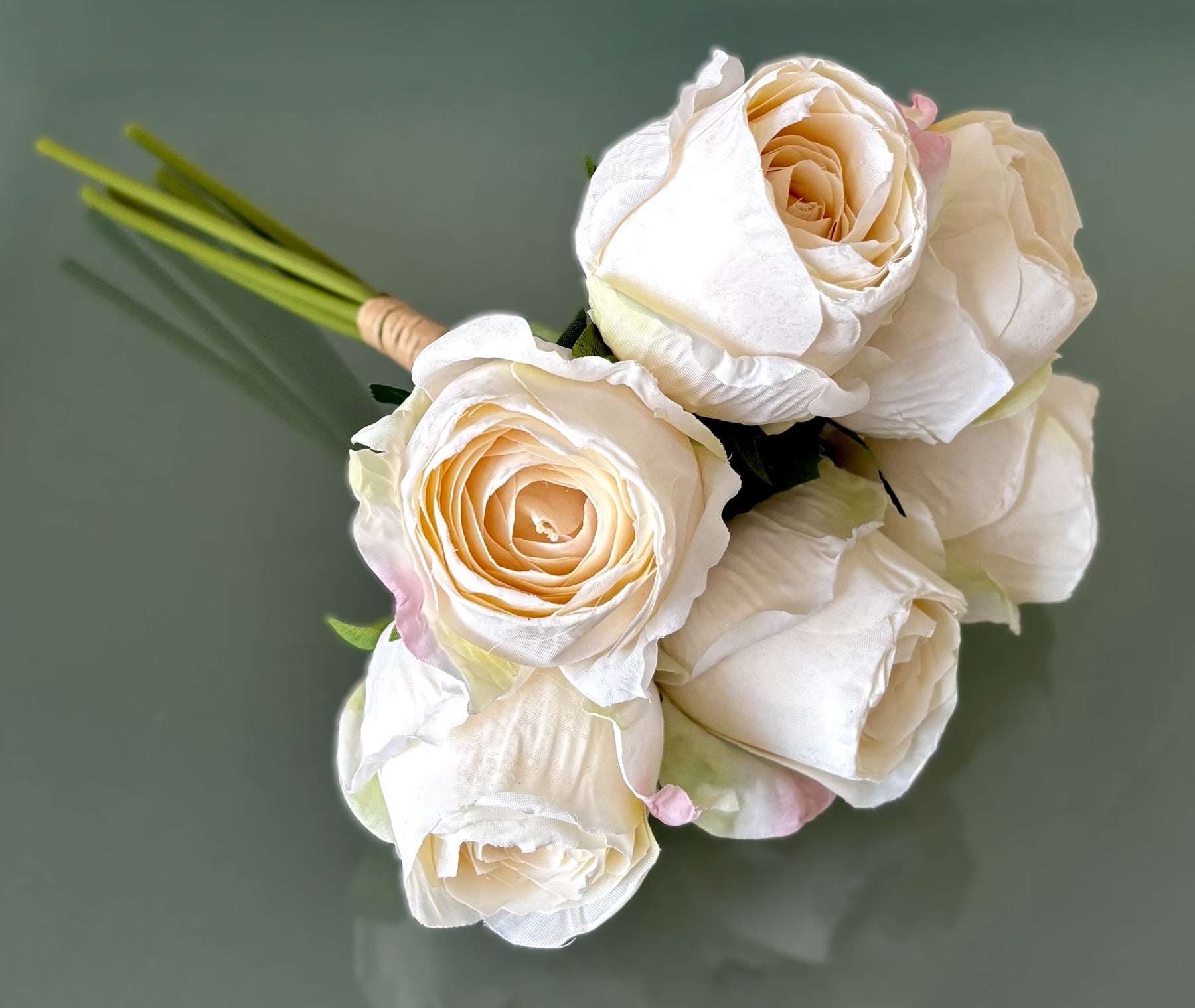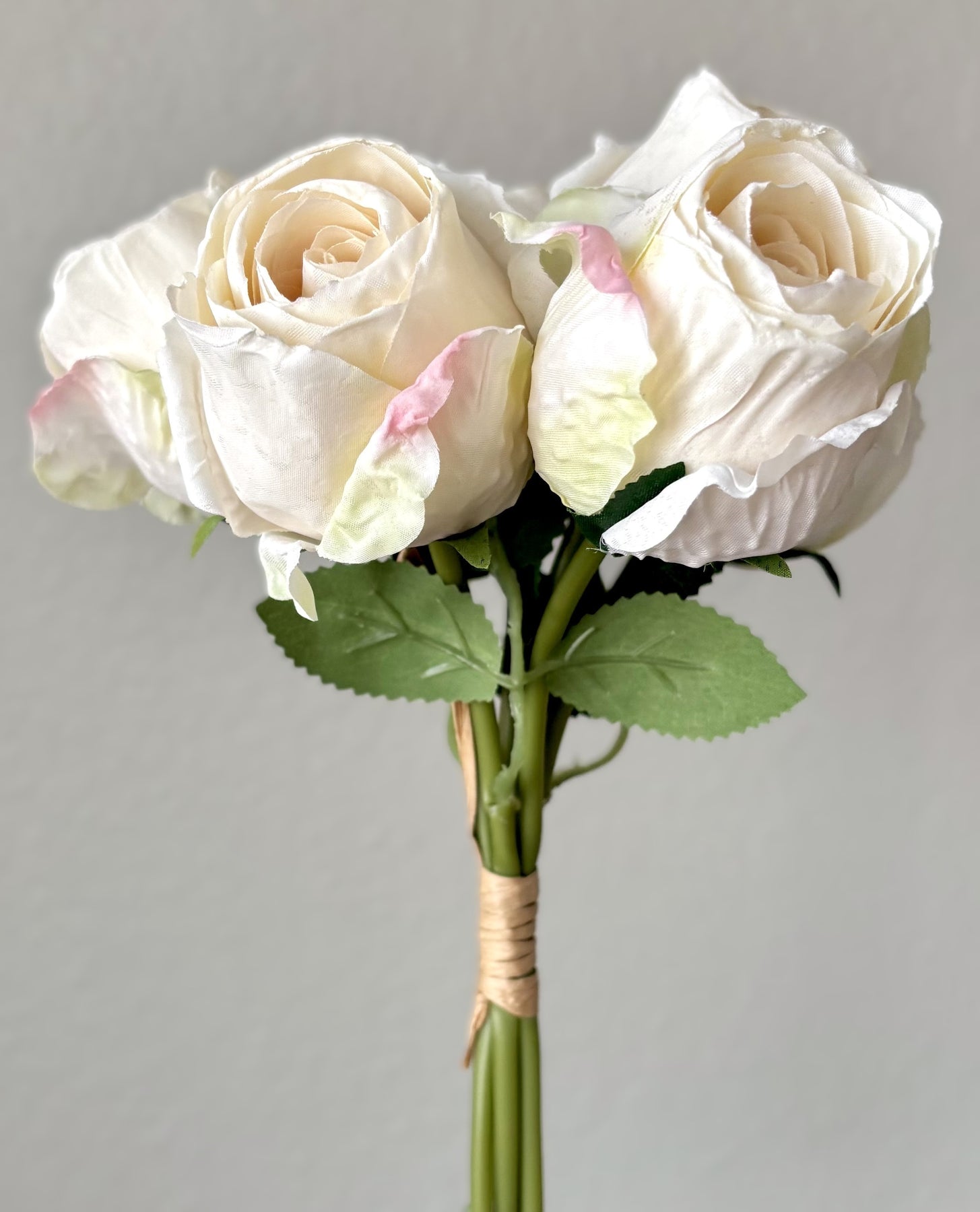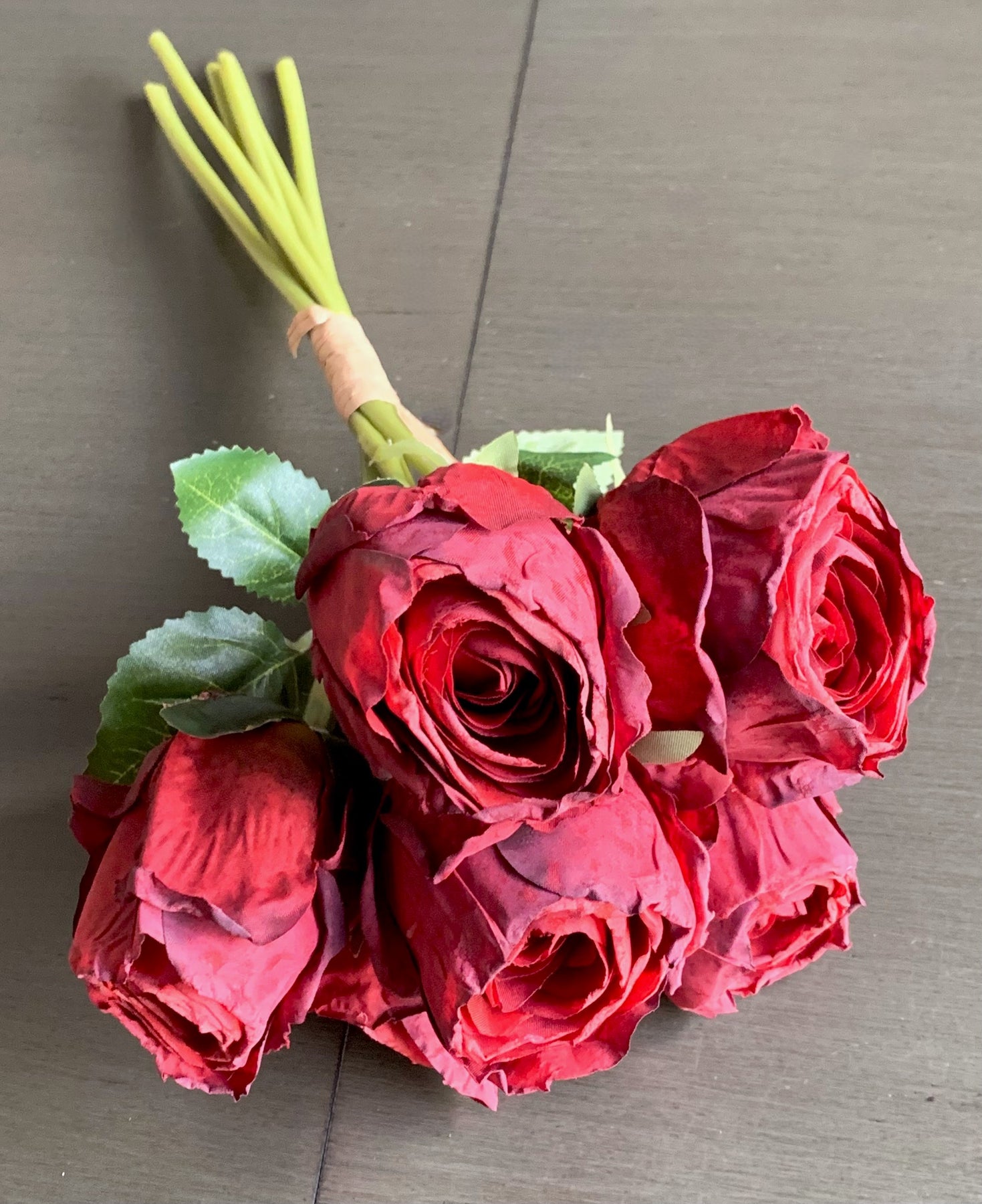 These roses are crafted to look like perfect buds; beautiful and very realistic-looking. Each bud is generously-sized, measuring approximately 2 3/4"L x 2 3/4"W. Each rose has a slightly "burnt edge" giving the outside petals an even more realistic look. These beauties come in a raffia-tied bundle of six stems. Four colors are available: Creamy White w/ light Blush accent, Pink, Deep Red and Orange. The multi-tonal colors have great dimension, adding to the overall realistic beauty.