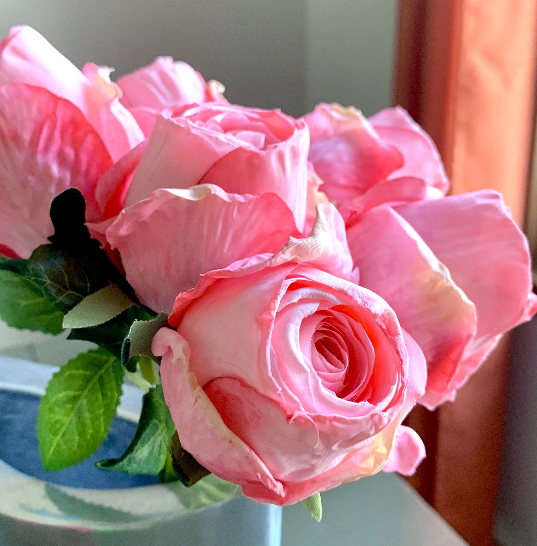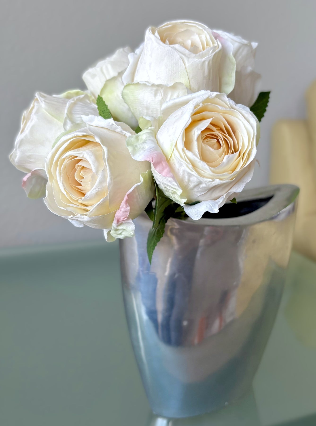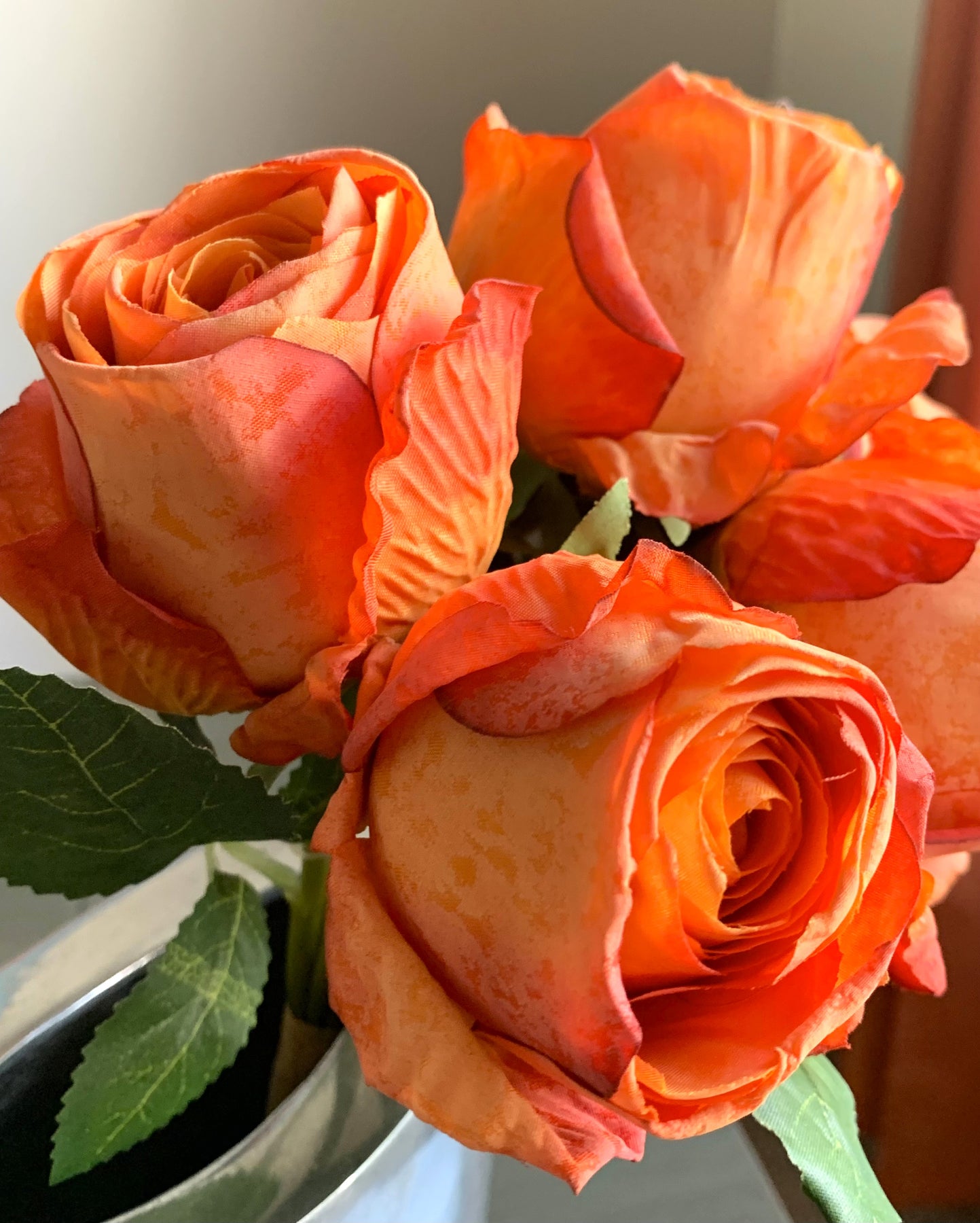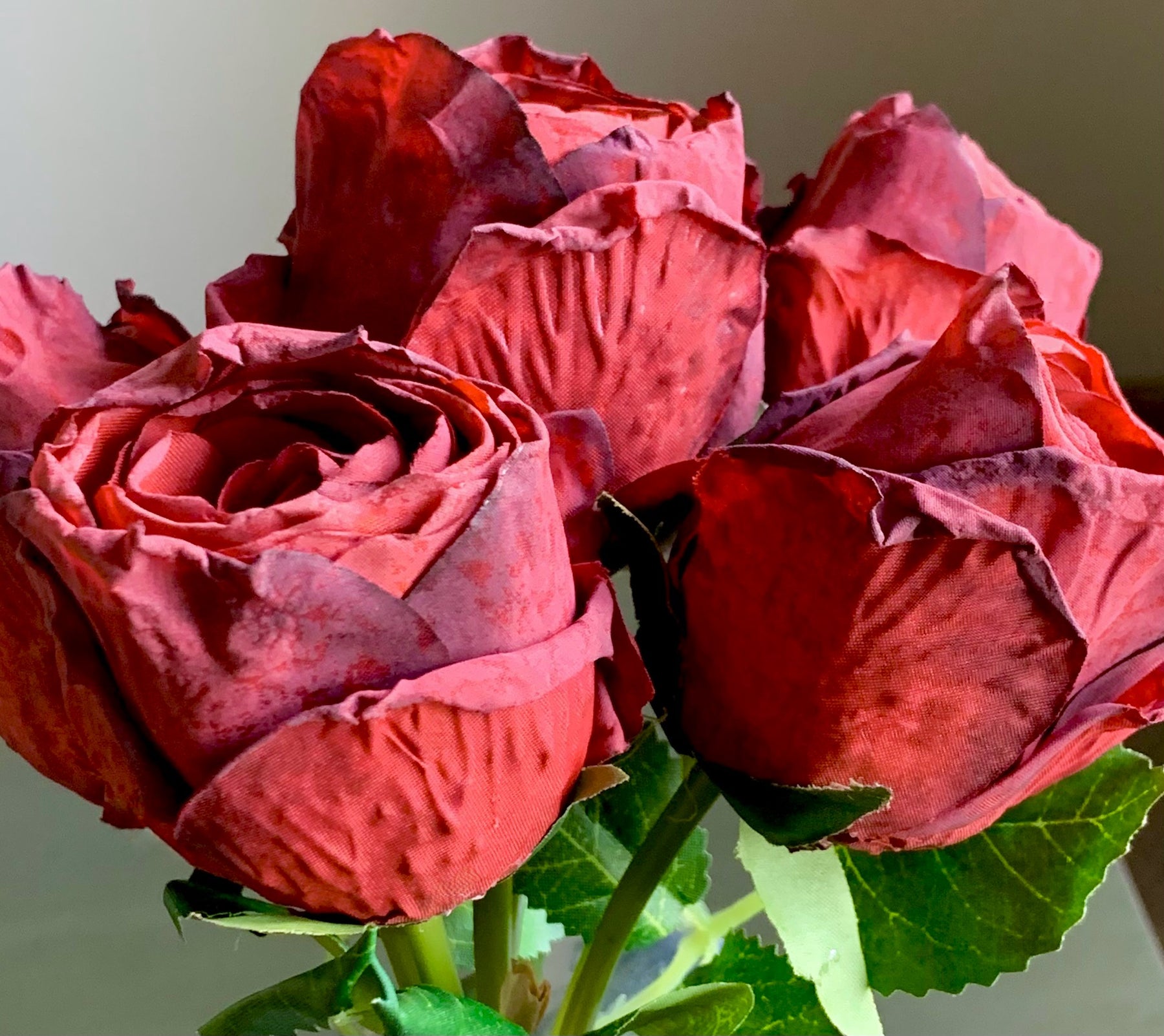 These roses are crafted to look like perfect buds; beautiful and very realistic-looking. Each bud is generously-sized, measuring approximately 2 3/4"L x 2 3/4"W. Each rose has a slightly "burnt edge" giving the outside petals an even more realistic look. These beauties come in a raffia-tied bundle of six stems. Four colors are available: Creamy White w/ light Blush accent, Pink, Deep Red and Orange. The multi-tonal colors have great dimension, adding to the overall realistic beauty.
