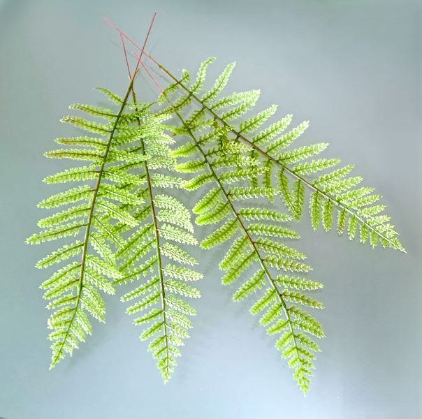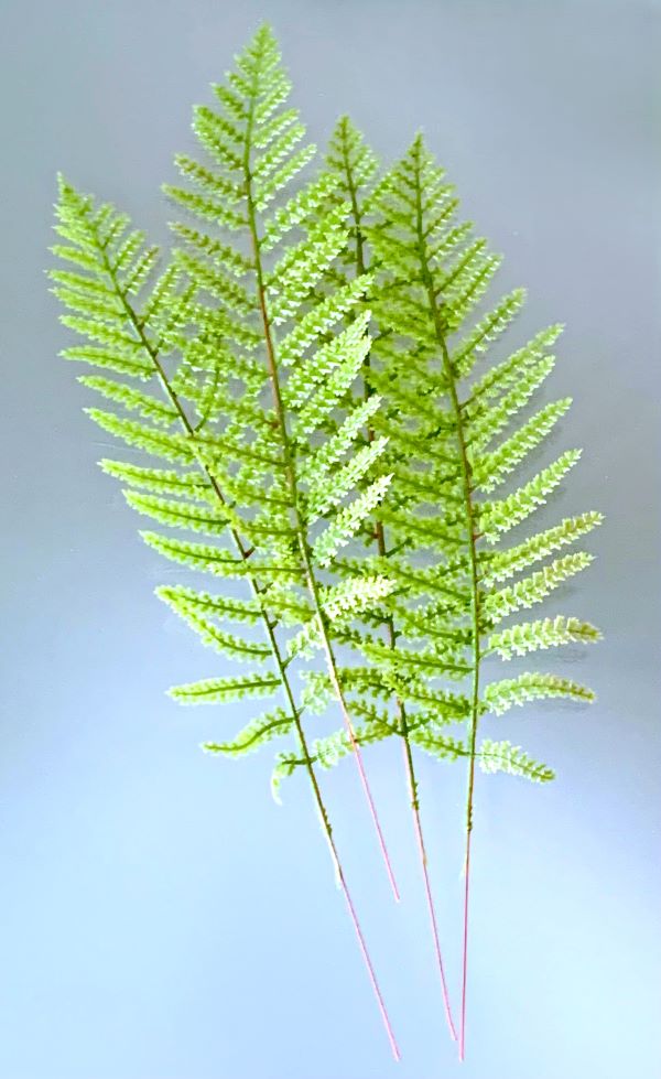 These fern fronds are so delicate and lacey; they look and feel very lifelike. They are perfect for enhancing a floral or greenery arrangement. You will receive a set of four fronds - just the right number for displaying in an arrangement. However, you might want a fuller look and opt for more. The green is ever-so slightly tinged with reddish brown on the ends - this color gradation is very subtle, extremely realistic and not uniform.