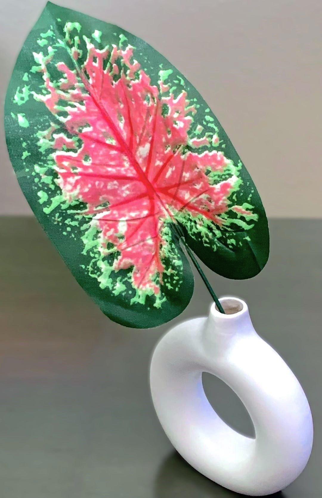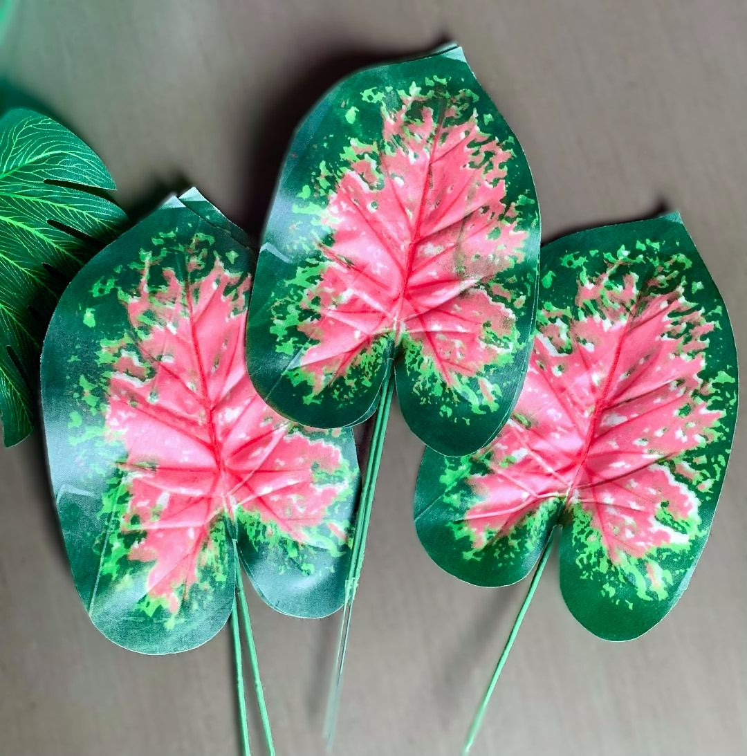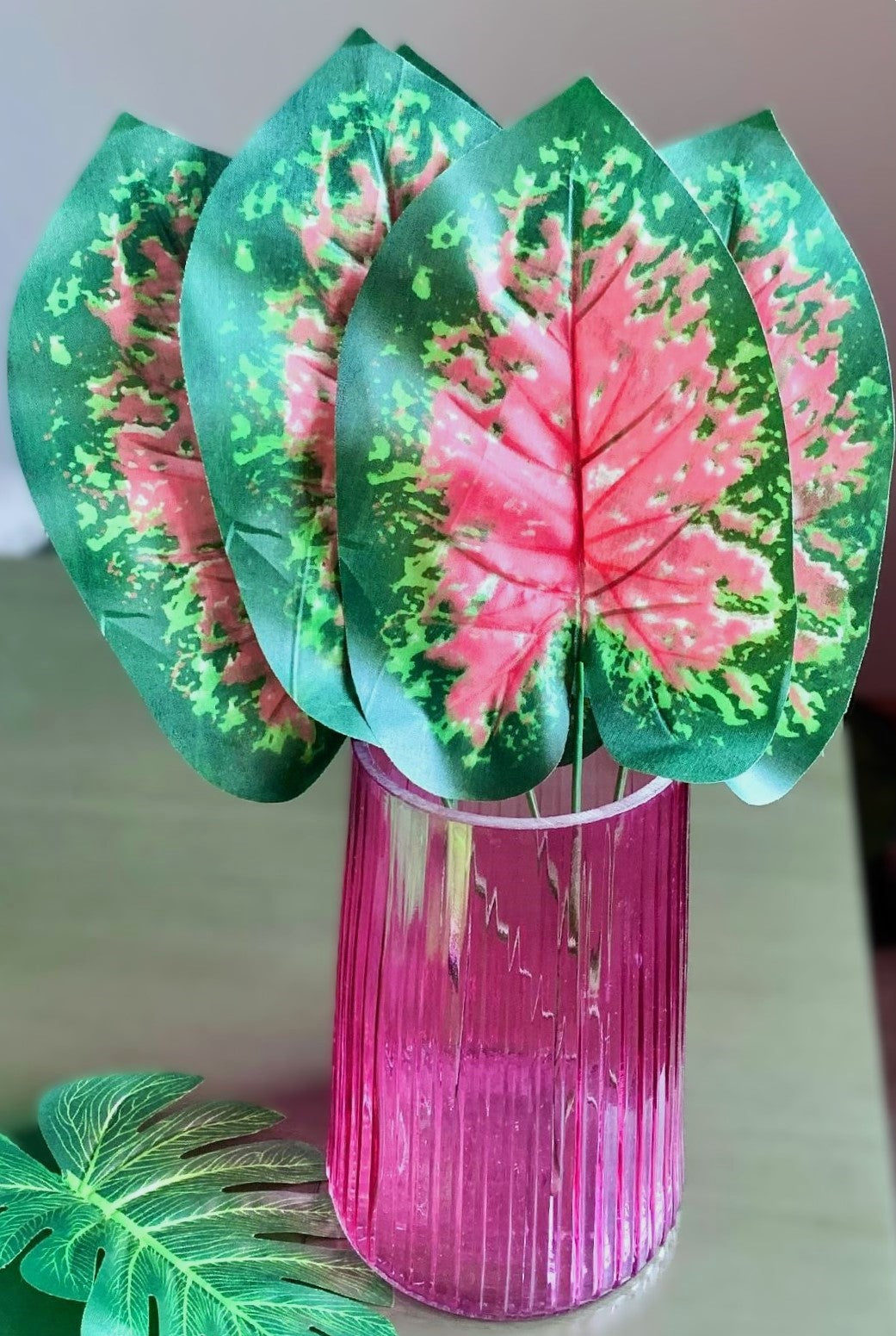 These are nice-sized tropical Croton leaves. The leaf itself measures 8 1/4"L x 5 1/2" wide. You will receive 5 stems of this large decorative tropical leaf. The leaves feature an eye-catching pink and green variegation. The variegation and veining is realistic and looks great. These leaves are bendable and posable. Put just one in a decorative vase and you have an artsy decor piece.