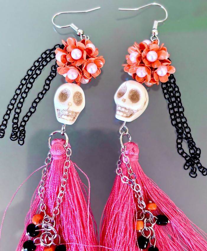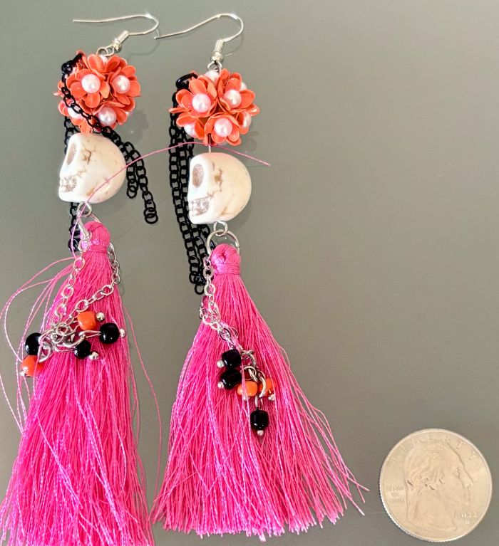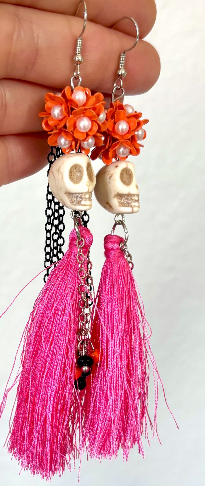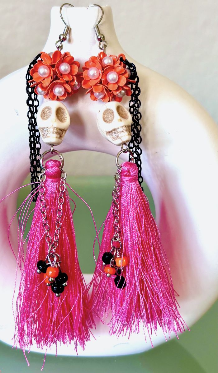 Celebrate Halloween with a unique touch of whimsy with these handcrafted Pink Tassel Skeleton Halloween Earrings. They are perfect for celebrating Dia de los Muertos! Each earring showcases a detailed skeleton head adorned with an elegant floral headpiece decorated with metal orange flowers and delicate pearl beads, creating a festive yet sophisticated look. Three black chains dangle from the headpiece, adding movement and dimension, while a vibrant silky pink tassel forms the body, making these earrings stand out with bold color and texture.