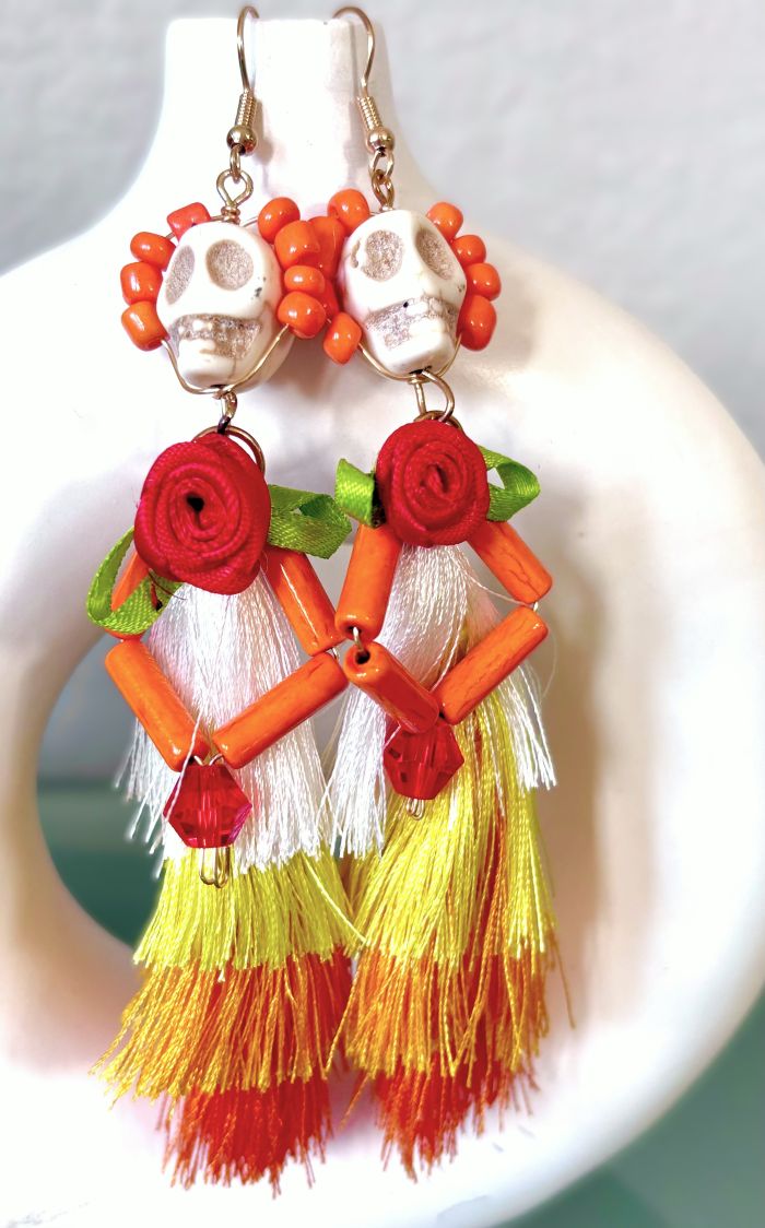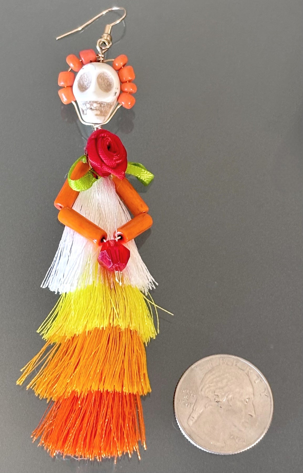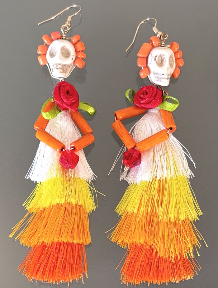 These distinctive female skeleton earrings showcase vibrant Mexican flair, ideal for honoring Dia de los Muertos. Featuring a skeleton head bead adorned with an orange "floral" crown, each earring highlights a bold red rose at the neck.