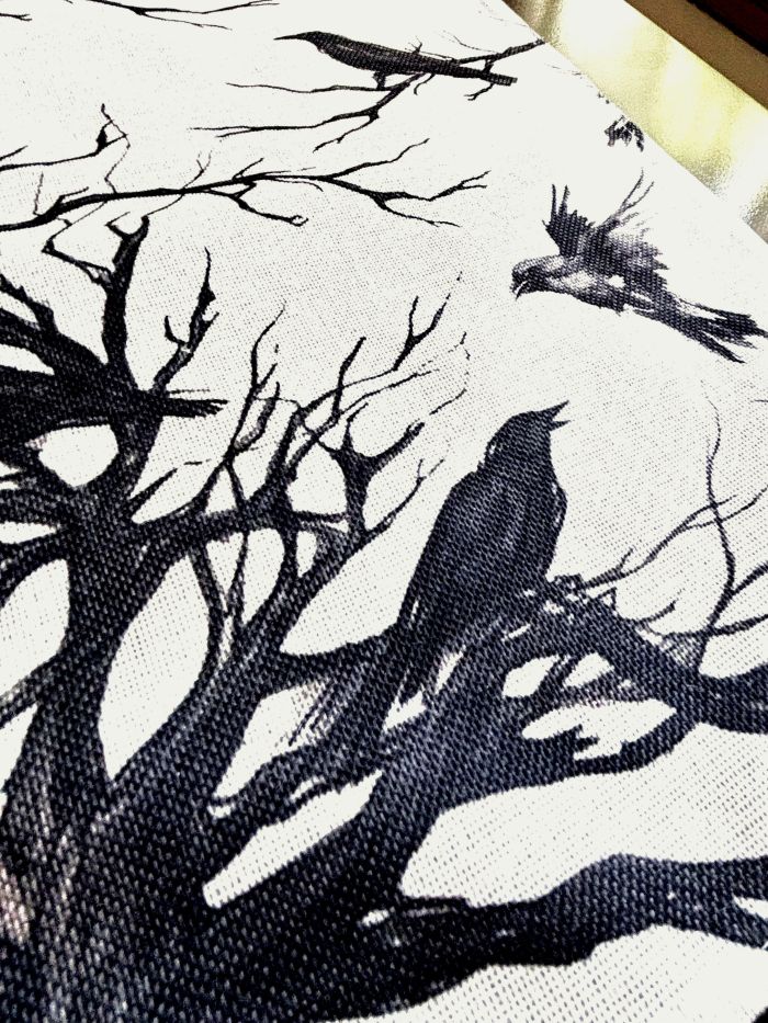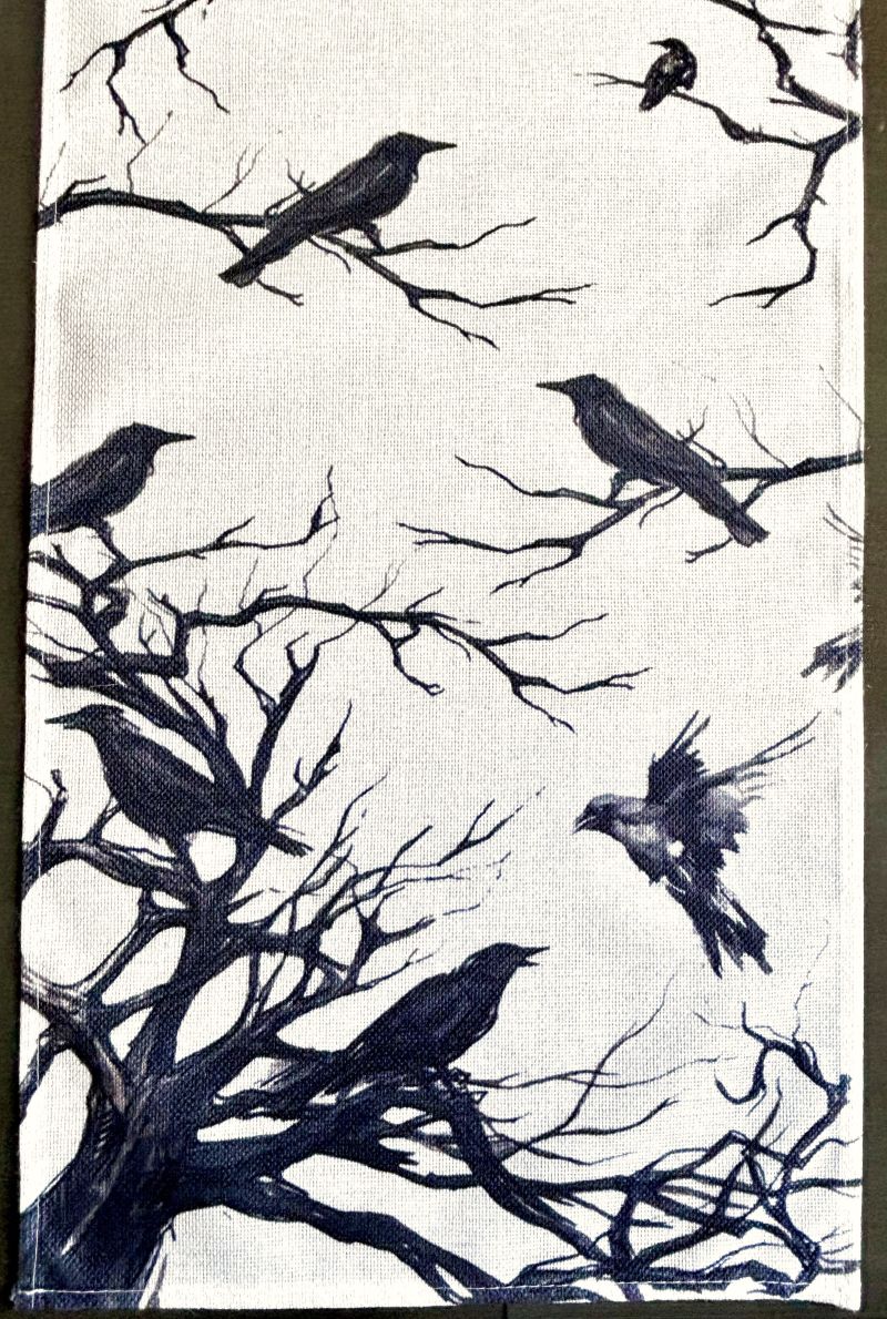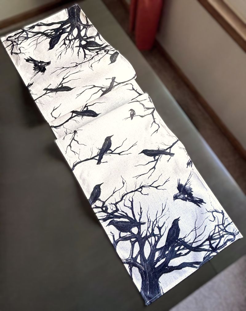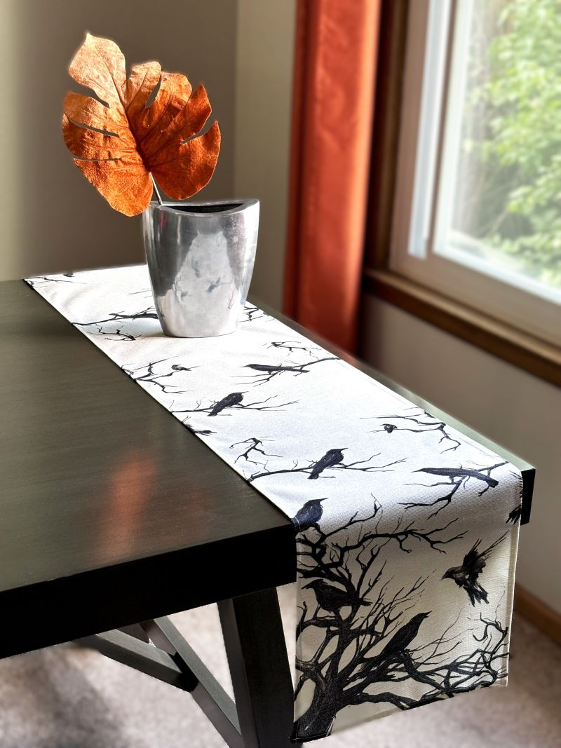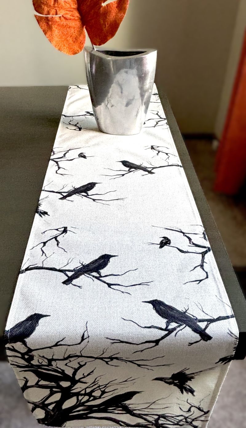 This table runner is as artistic as it is spooky. It features a very interesting design of black ravens (or crows) perched in black tree silhouettes. Both ends feature the same design and birds and branches are shown along the length of the runner. This can be displayed during the autumn months (Halloween of course!) but would also look intriguing in certain decor schemes throughout the year.