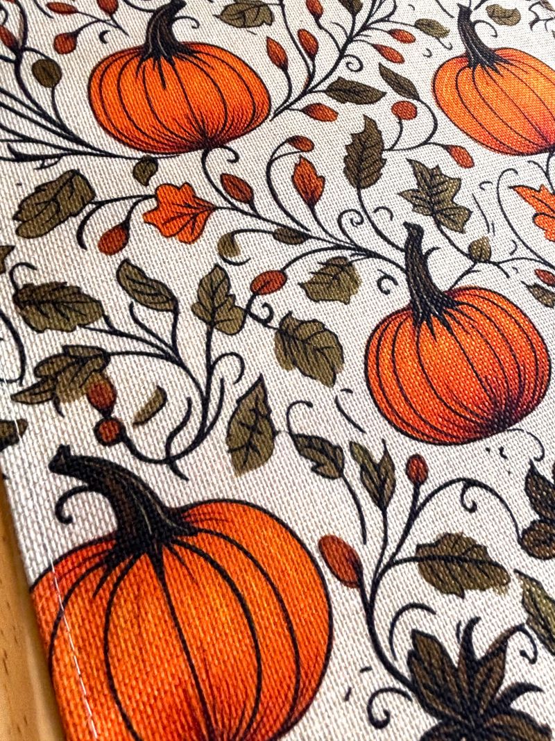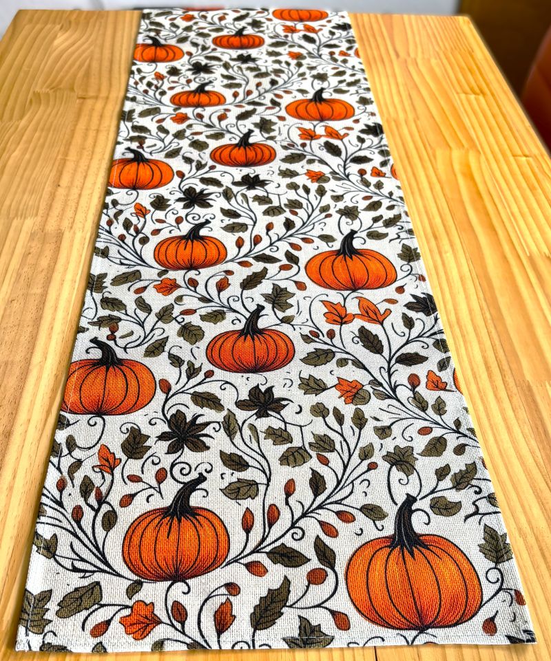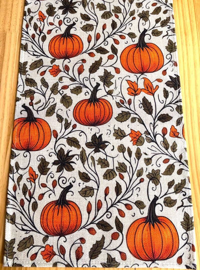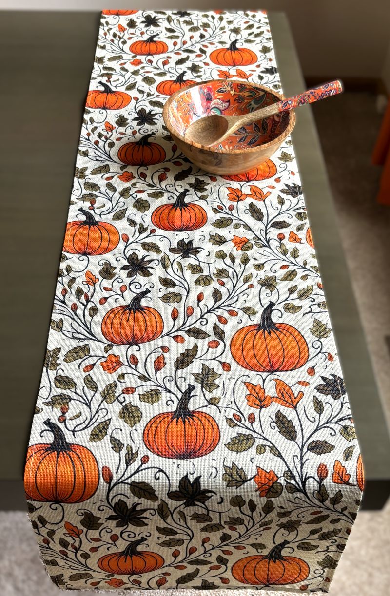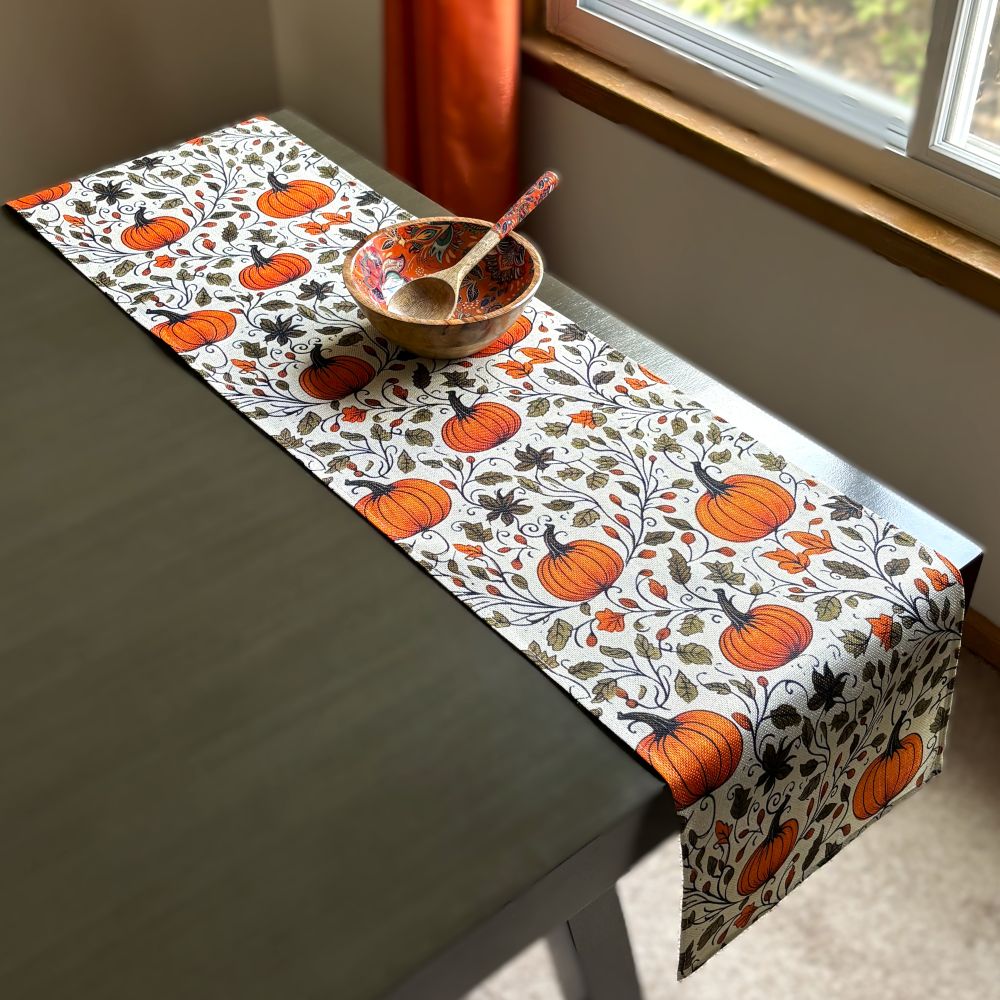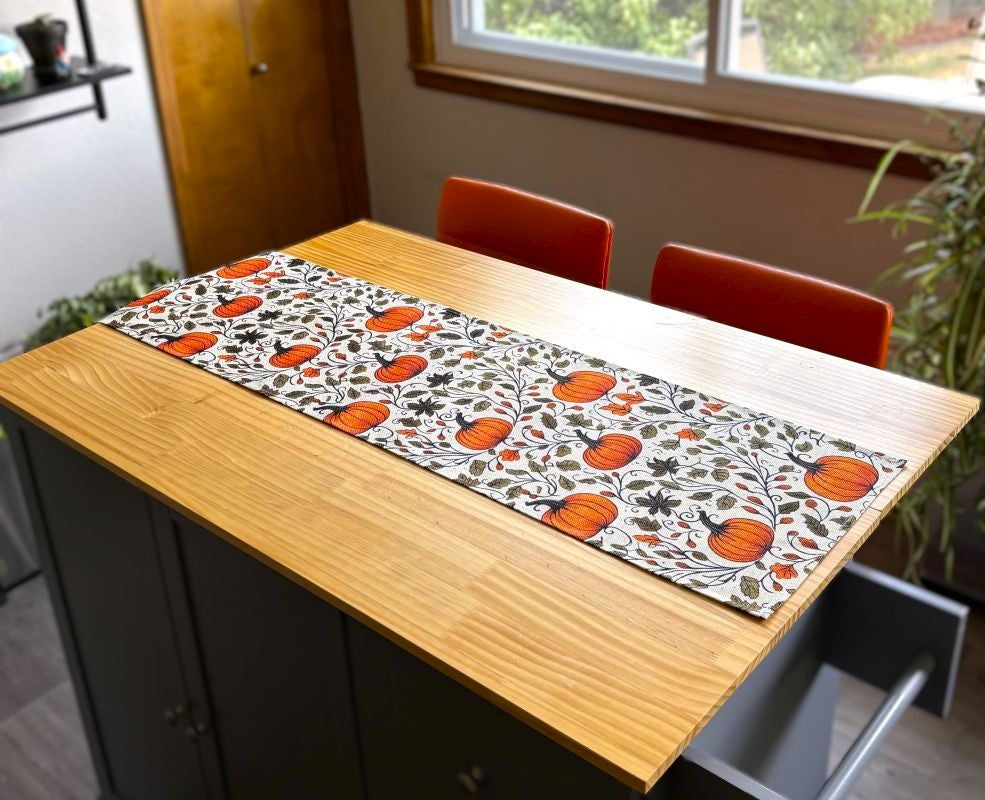 This seasonal linen table runner showcases a delightful pumpkin and leafy vine pattern, perfect for farmhouse and cottage styles yet versatile enough to complement most décors.