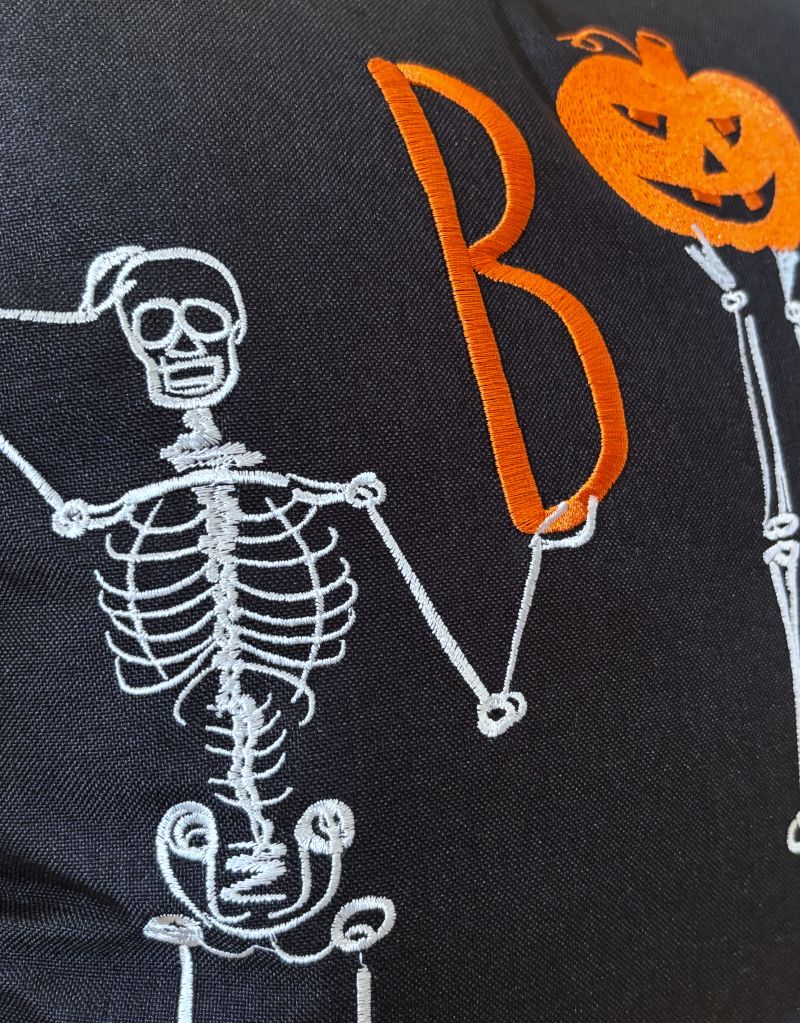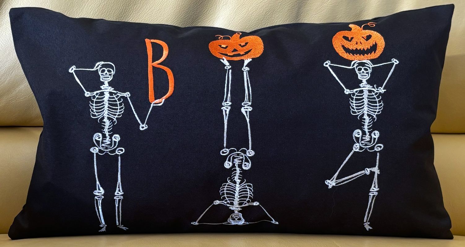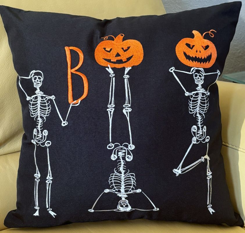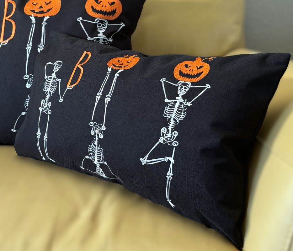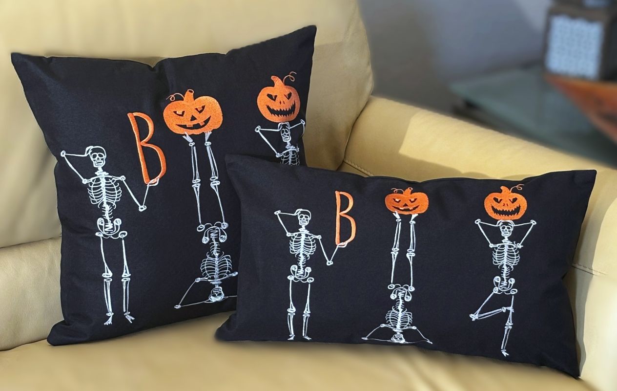 Celebrate Halloween with a playful twist using these embroidered pillow covers, available in two sizes to suit your space. Featuring three skeletons striking yoga-inspired poses, the design cleverly spells out "BOO" with one skeleton holding a letter "B" and the others creatively balancing bright Jack O' Lanterns. The rich orange, black, and white color palette adds festive charm while maintaining a creative, spooky vibe. These durable covers bring a unique blend of whimsy and Halloween spirit to your décor.