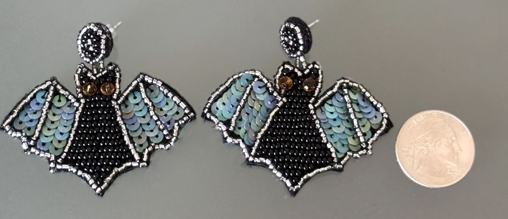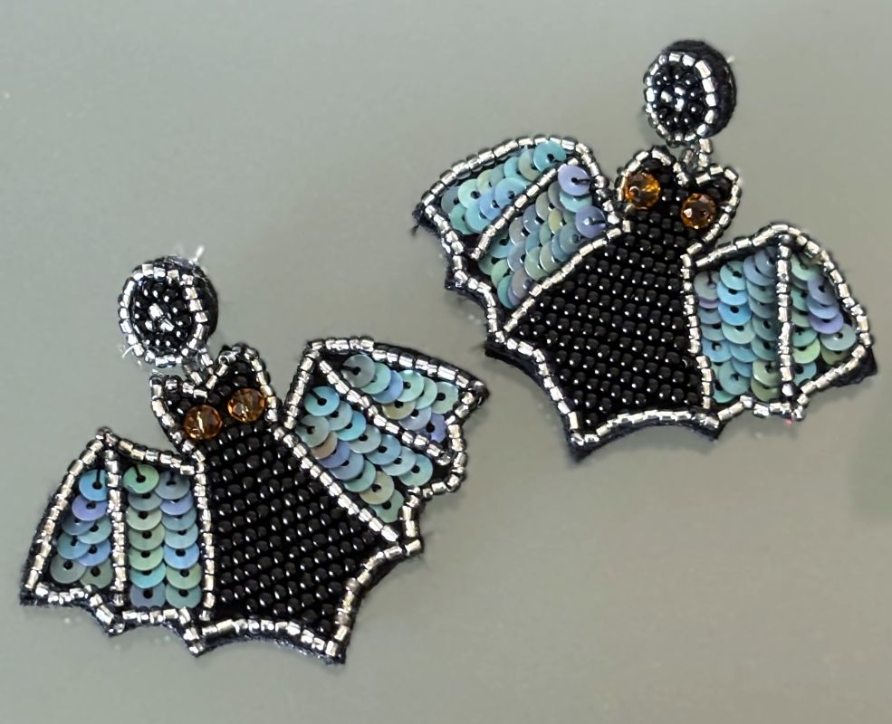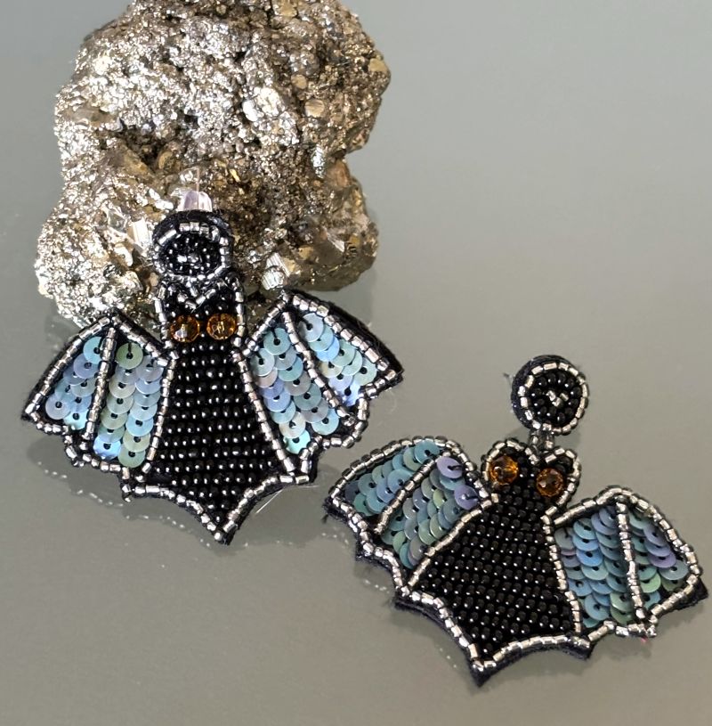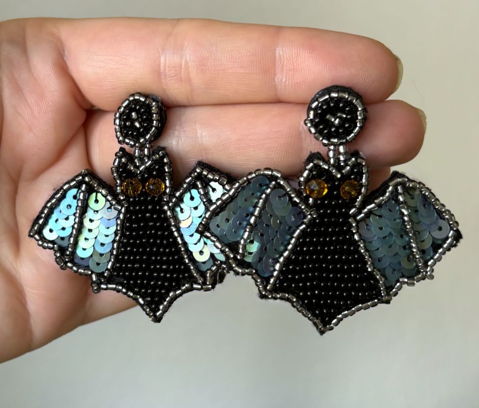 These earrings are both adorable and spooky! Handcrafted with beads and sequins, these flying bat earrings capture the spirit of the season perfectly. Featuring black glass seed beads, shimmering blue-gray sequins, and amber crystal eyes on a black felt base, they’re lightweight and comfortable enough for all-day wear. Add a touch of eerie charm to your look this Halloween!