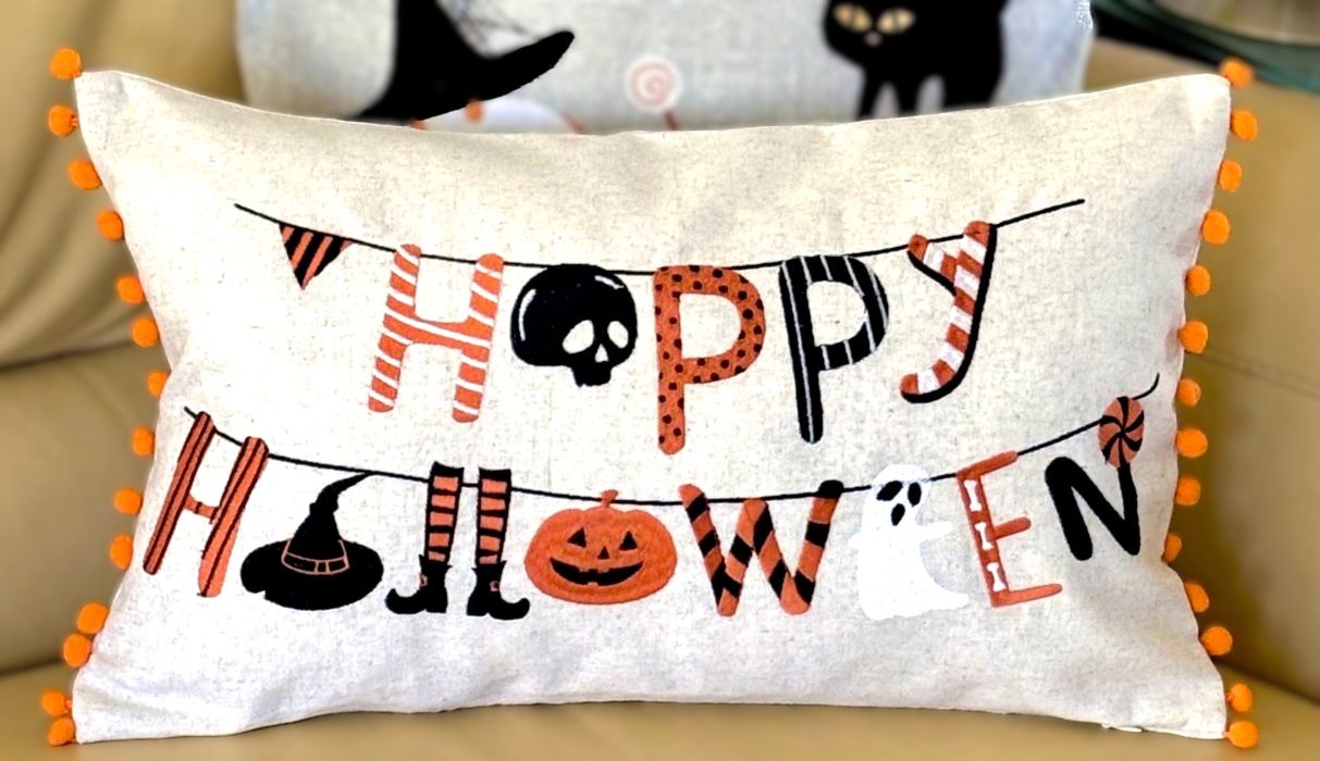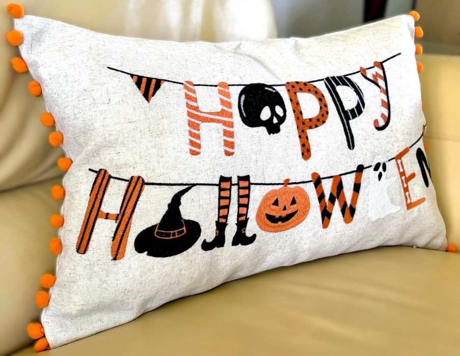 Adorned with orange pompoms on both ends, this pillow cover combines festive charm with durability thanks to its durable linen blend fabric. Perfect for adding a fun and spirited touch to your Halloween decor.