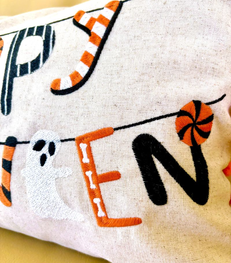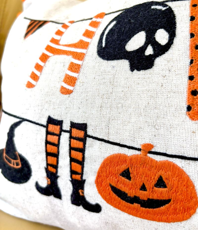 This delightful 12" x 20" Halloween pillow cover welcomes guests with a cheerful "Happy Halloween" banner. Its vibrant orange, black, and white embroidery showcases classic Halloween symbols like a witch hat, witch legs, a smiling Jack O' Lantern, ghost, skull, and playful patterns.