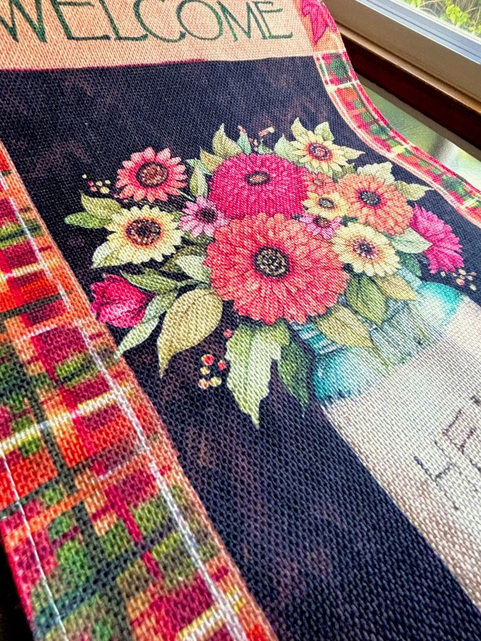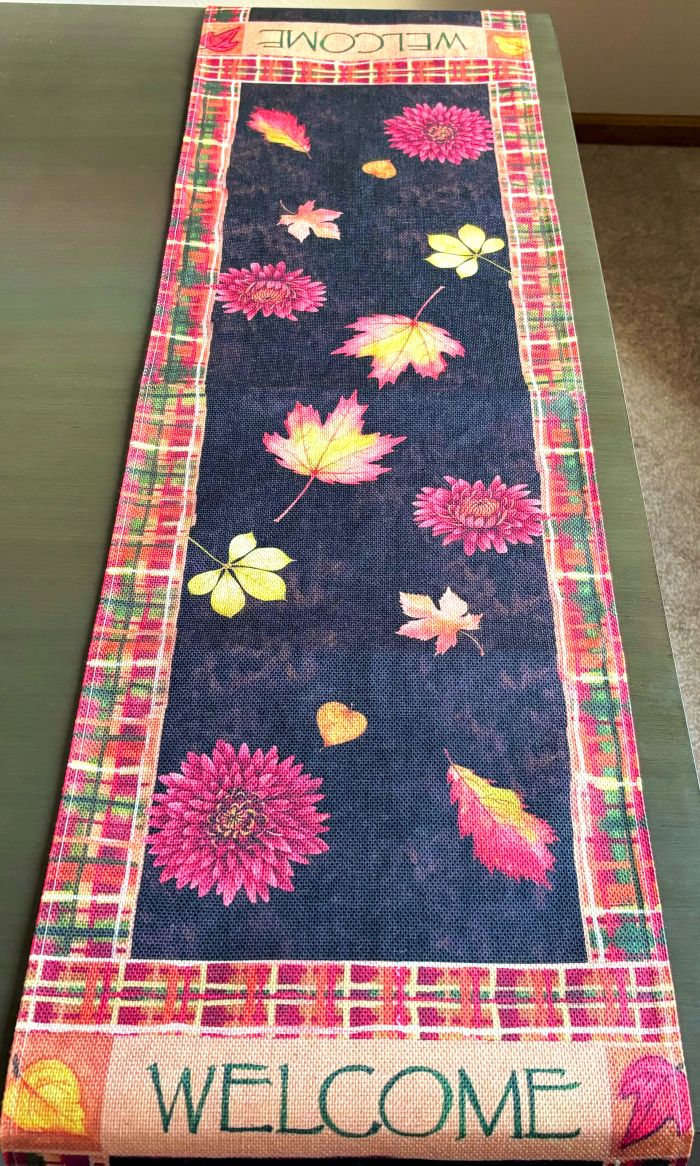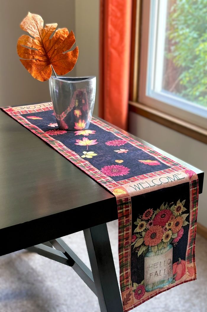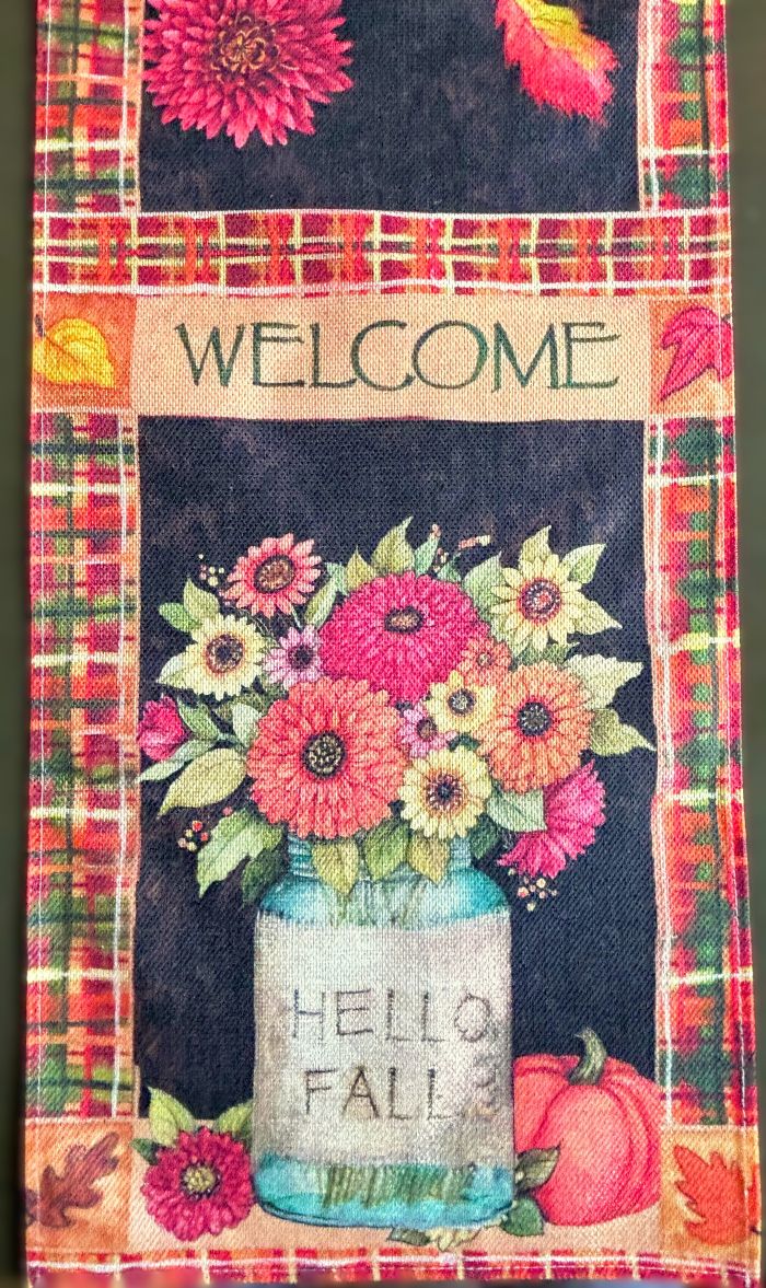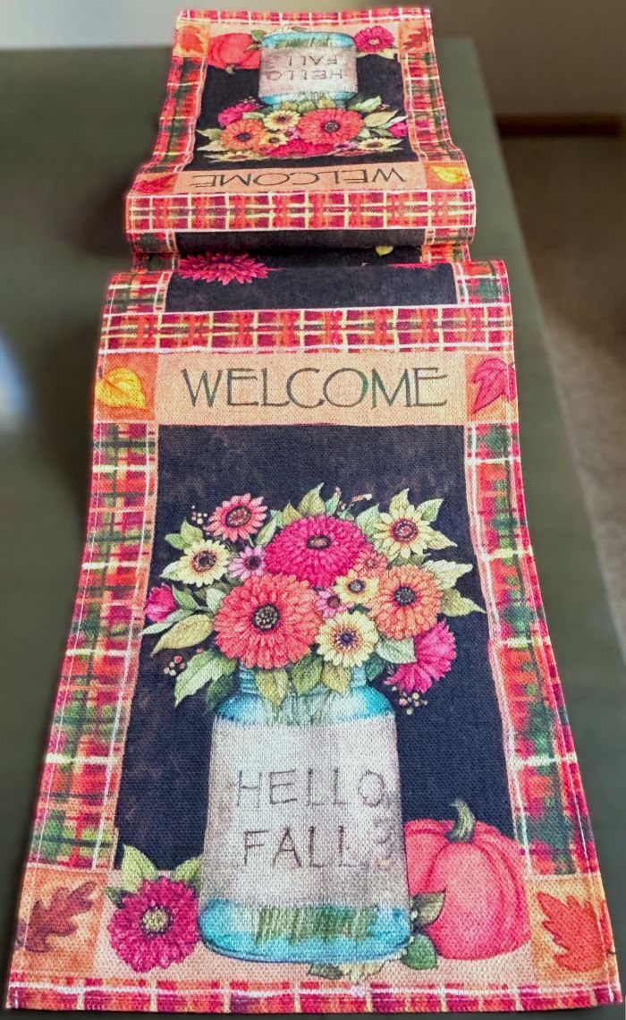 This runner is full of rustic farmhouse charm. Vibrant, full of color and a charming design! The design on either end of the 72" long runner is a fall floral arrangement featuring mums and sunflowers in a vase that reads "Hello Fall". Above these designs, it reads "Welcome". Various colorful fall leaves decorate the length of the runner and it is bordered with a colorful fall plaid. Very festive and charming!