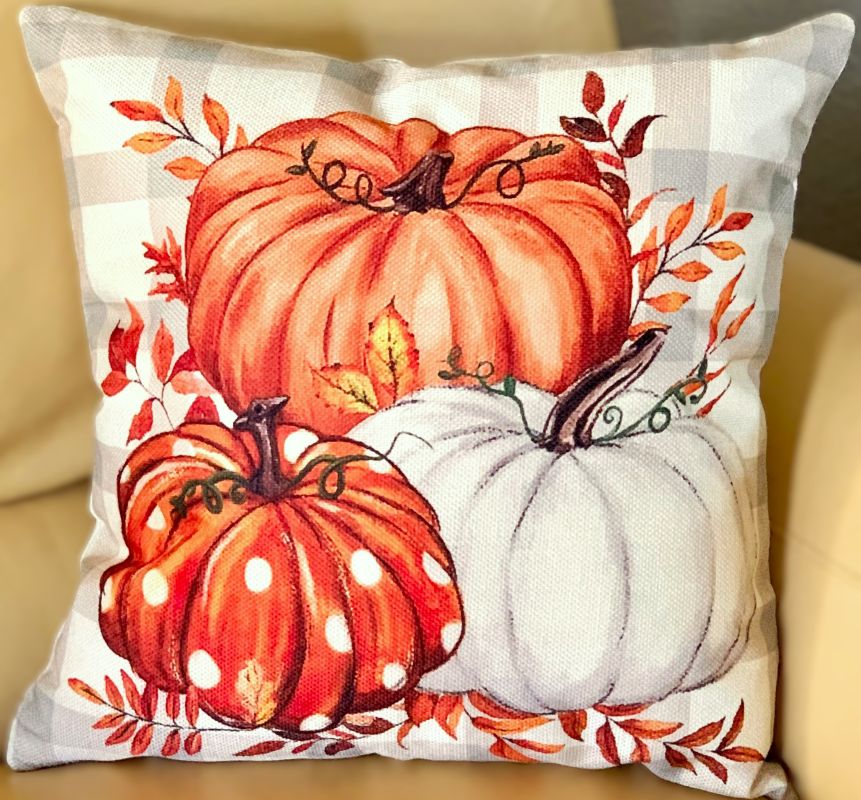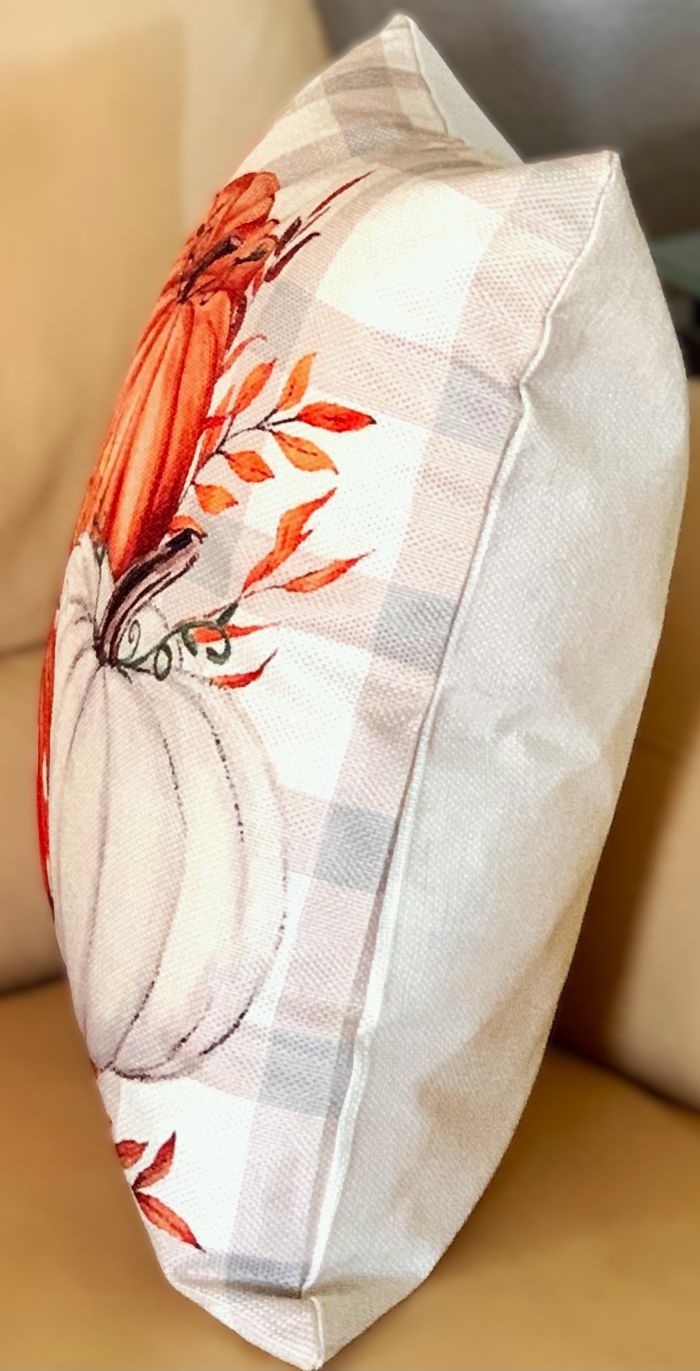 This set of two lively pillow covers brings cozy autumn charm to your space. One showcases three plump multicolor pumpkins, one decorated with polka dots, They are framed by fall leaves. It has a light gray/taupe/off-white plaid background. The complementary pillow cover highlights the same festive hues and proudly displays the phrase "Pumpkin Spice." Elevate your seasonal decor effortlessly with these charming designs.
