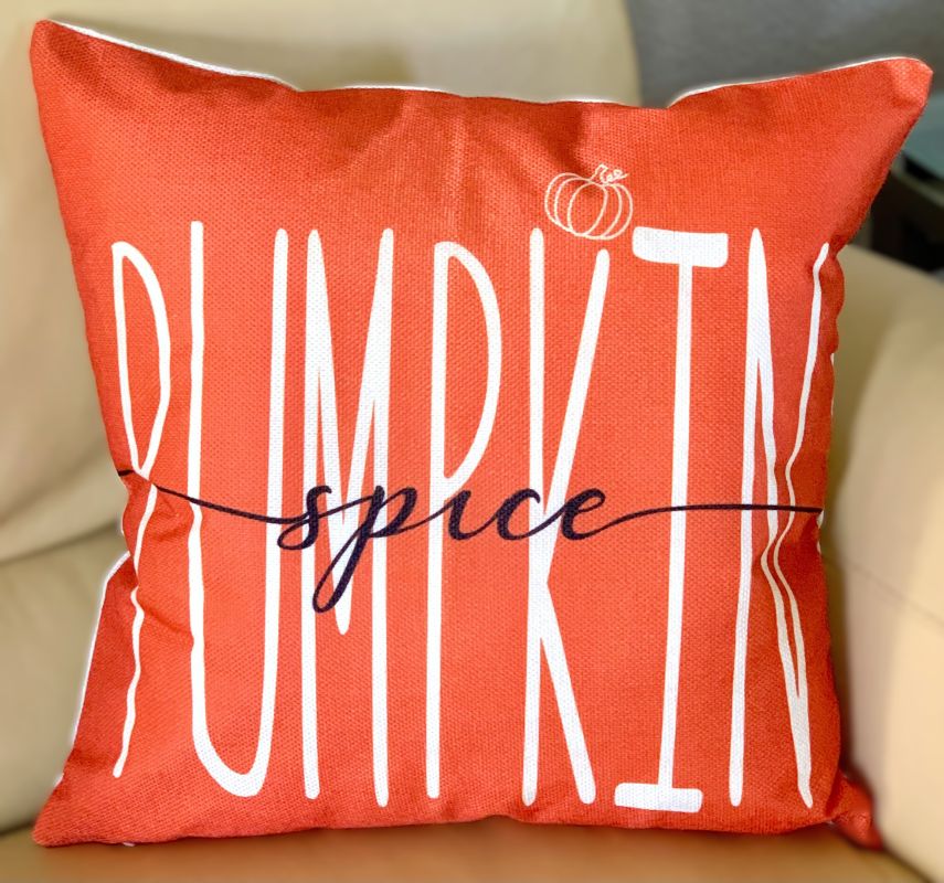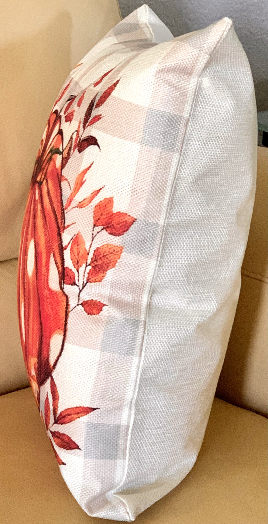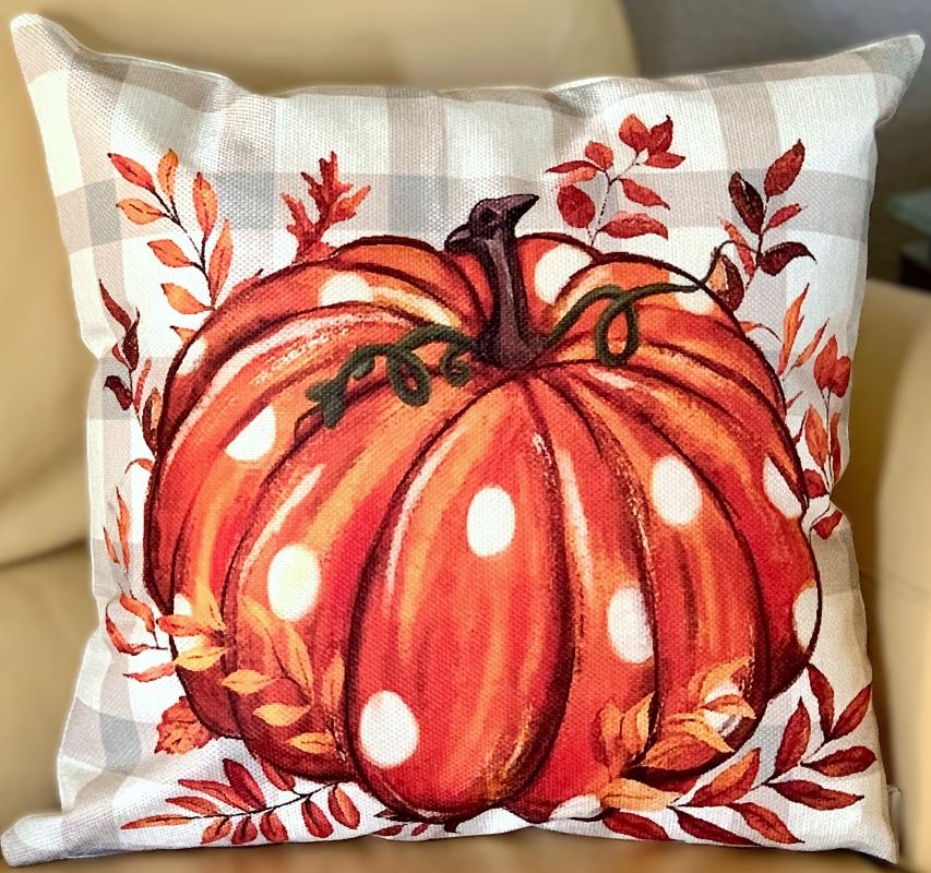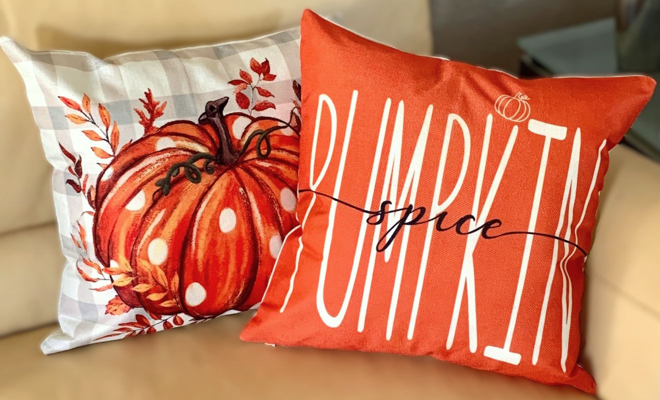 This set of two lively pillow covers brings cozy autumn charm to your space. One showcases a plump pumpkin decorated with polka dots, framed by fall leaves. It has a light gray/taupe/off-white plaid background. The complementary pillow cover highlights the same festive hues and proudly displays the phrase "Pumpkin Spice." Elevate your seasonal decor effortlessly with these charming designs.
