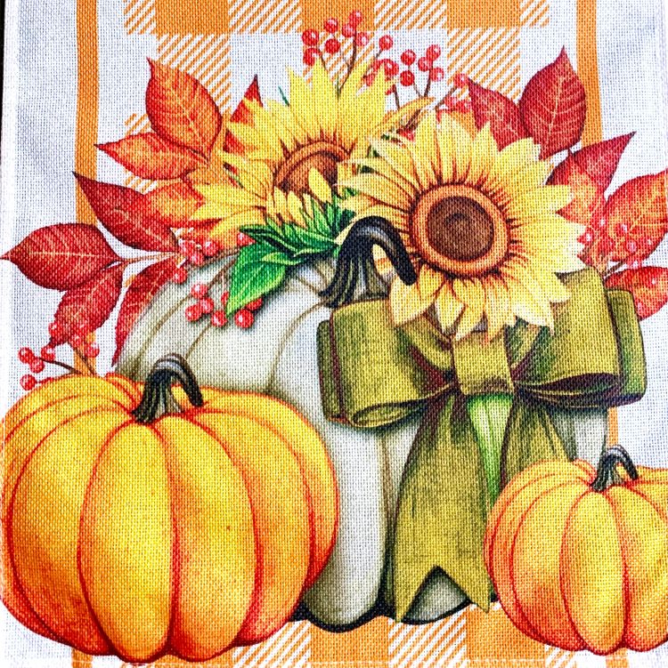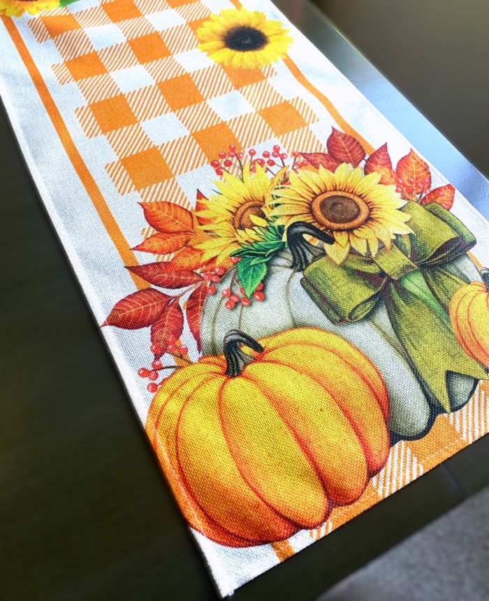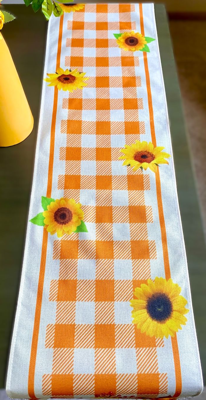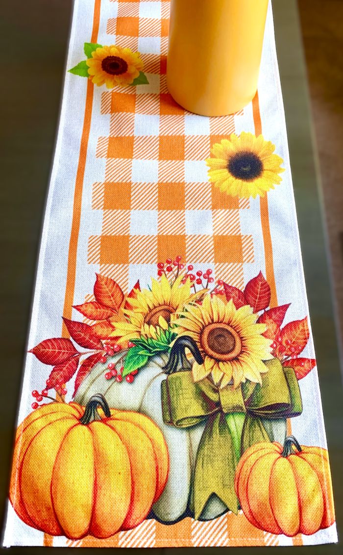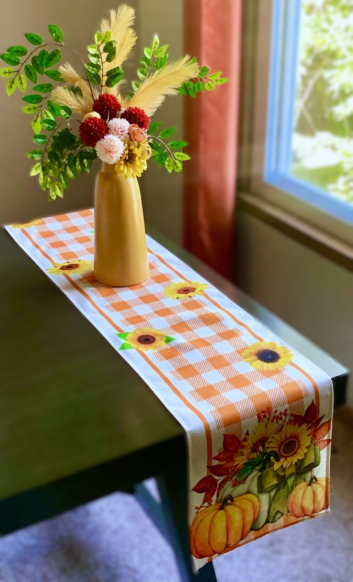 Celebrate the season with this vibrant autumn table runner, featuring a lively orange and natural colored buffalo check plaid adorned with sunflower blooms. Measuring 72" long, it showcases a charming fall arrangement at each end - a large white pumpkin with two smaller orange pumpkins, a big green bow, red leaves and berries, and sunflowers. Designed so that it looks fabulous from every vantage point!