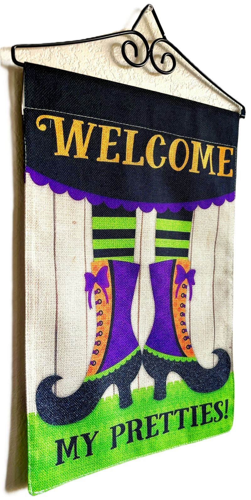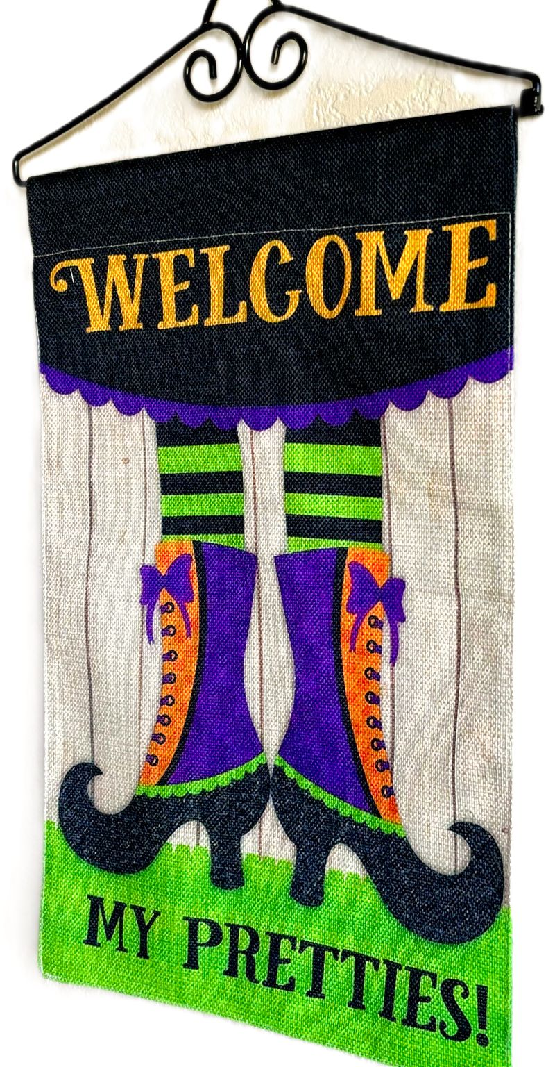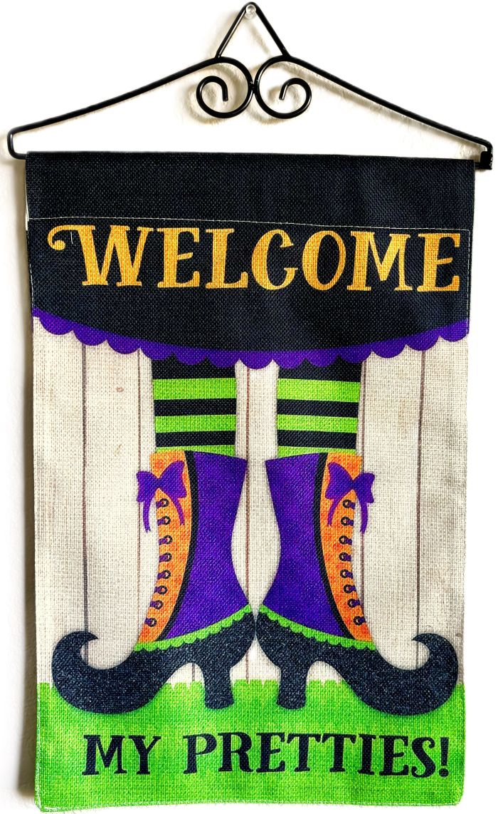 This fun and whimsical garden flag features a witch's legs wearing fancy boots and striped stockings reading "Welcome My Pretties!" The bright color scheme of lime green, orange and purple makes this a great flag for lovers of all things "witch" to decorate with at Halloween!