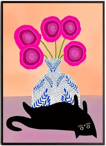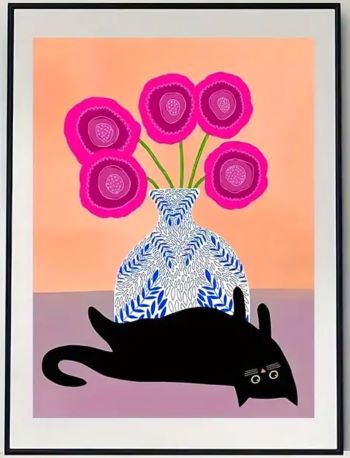 This is a colorful print that will add character to any space. A stylized black cat lounges in front of a decorative vase filled with vibrant pink flowers. With a fun design, vibrant colors, and great color contrast, this art print captures the essence of whimsical charm.