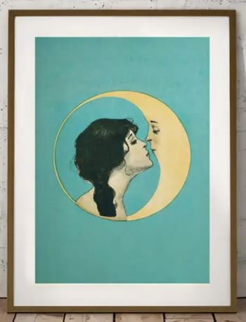 This art print has great vintage Art Nouveau flair. Features a woman encircled by the moon, both looking as though posed for a kiss. The black, teal and pale yellow colors of the print makes for very appealing color contrast. From the 1920 book, "Dear Old Dixie Moon".