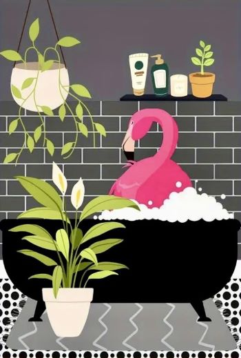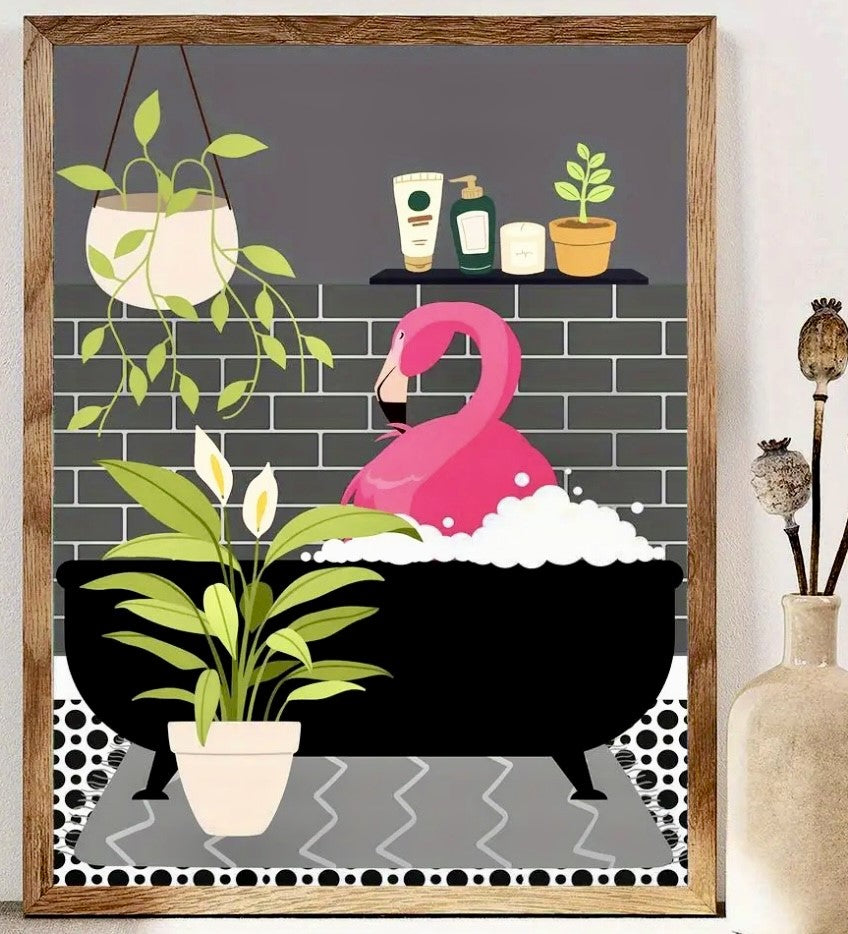 Created with superior canvas fabric and high-quality printing techniques, this art print showcases a whimsical image of a bright pink flamingo indulging in a bubble bath. Surrounded by soothing plants and spa products, this print is sure to bring a playful and delightful touch to any space.