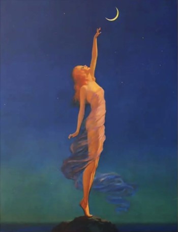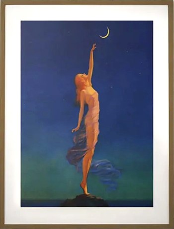 This is a gorgeous Giclée art print of the 1930's Art Deco piece Reaching for the Moon by Edward Mason Eggleston. Exquisite detail, color scheme and color saturation! Ethereal in style, the woman wears a sheer and flowy wrap as she gracefully stands on tiptoe to reach for the delicate crescent moon.