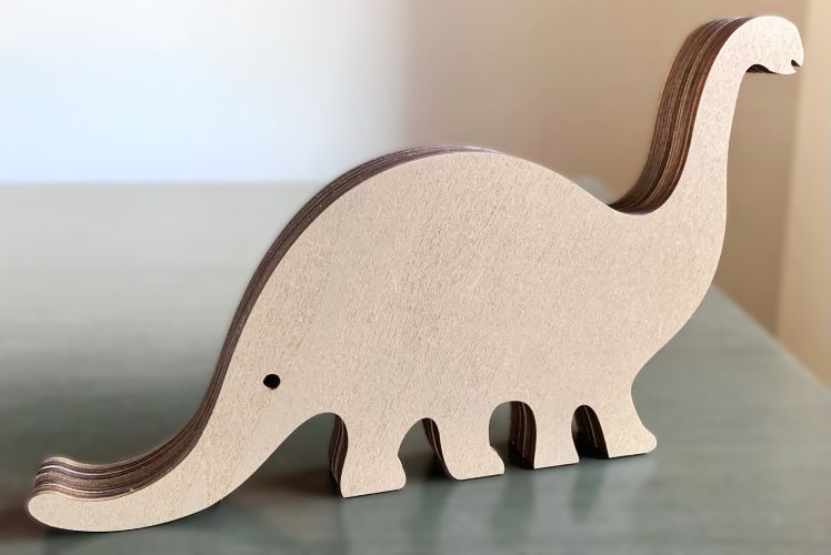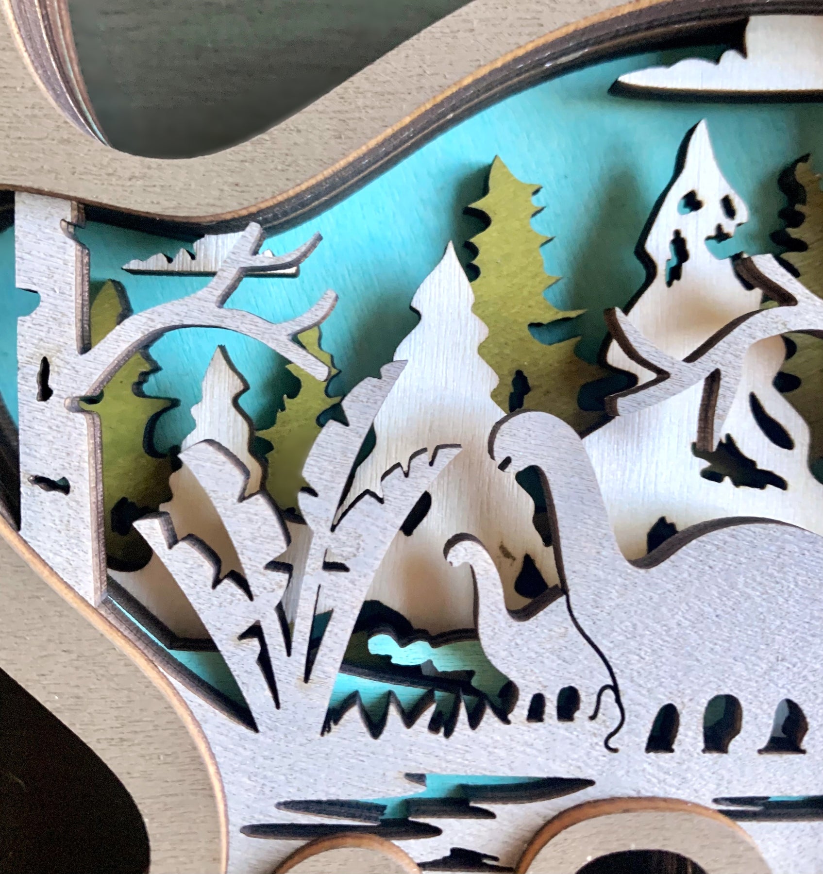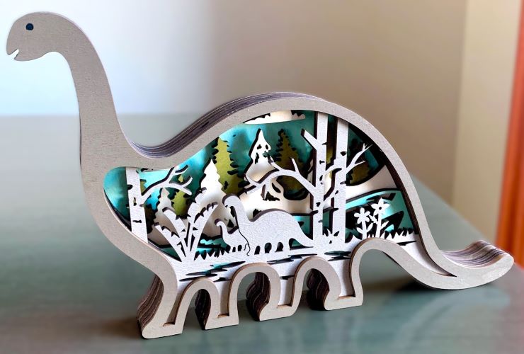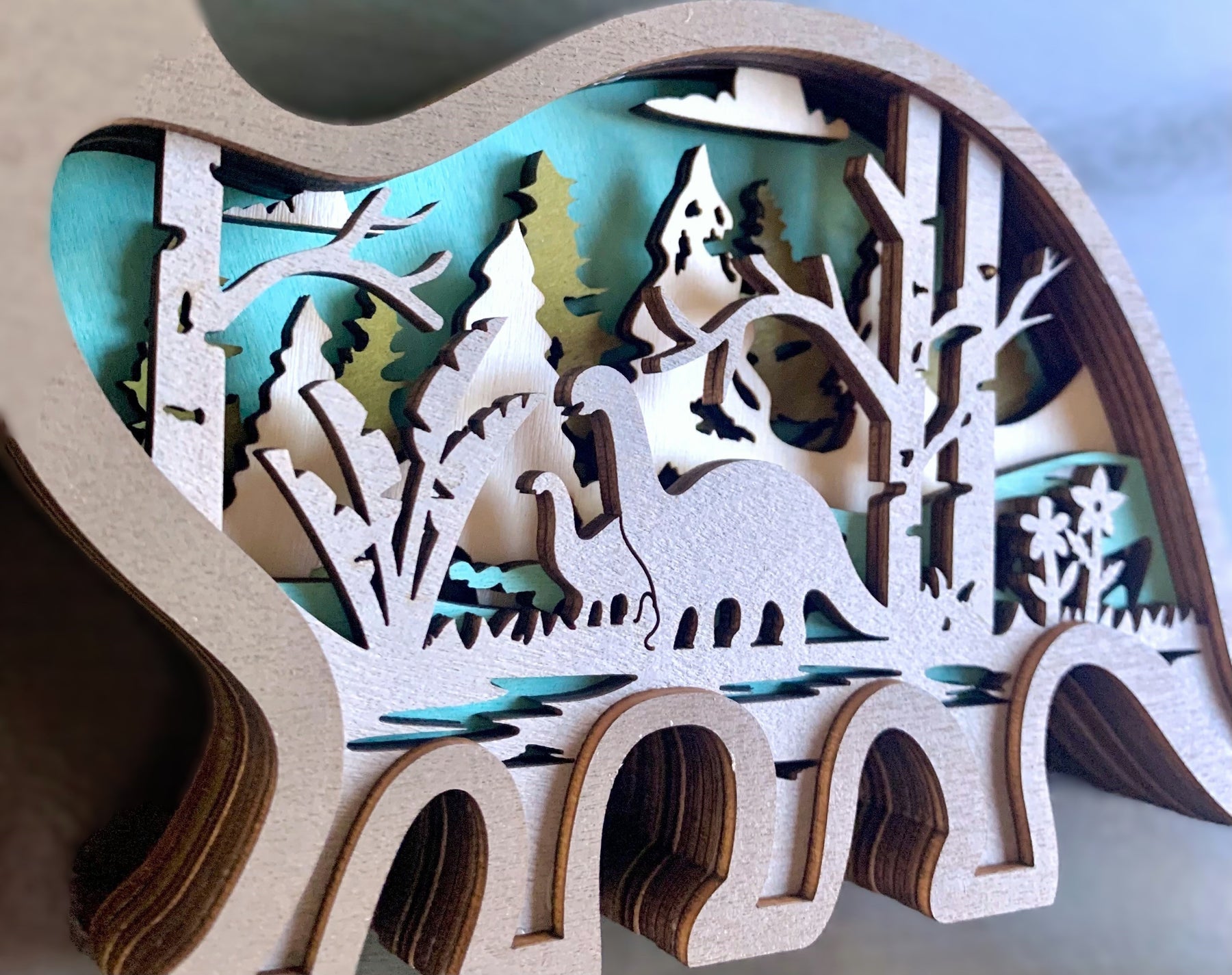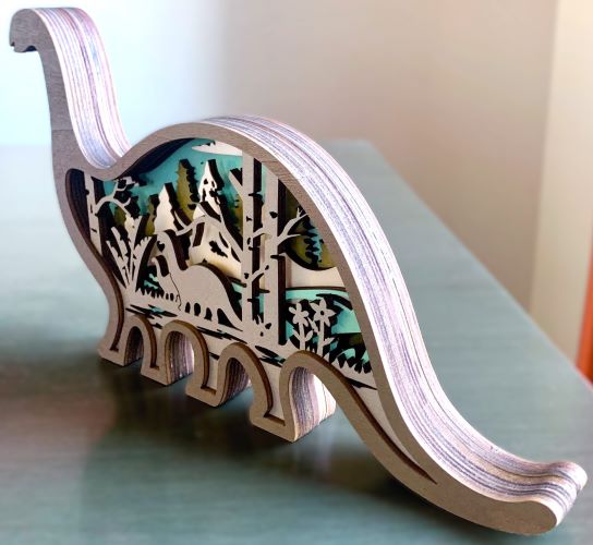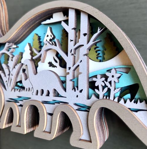 This is a very detailed 3D multilayered wooden diorama featuring a friendly Brontosaurus. Layers of wood are put together which creates the outside dinosaur shape which is stained taupe. Inside are multilayers of laser-cut stained wood in natural, gray, sage green and bright turquoise blue which adds a great 'pop' of color! The inside scene depicts a nicely-detailed Jurassic forest scene featuring trees, plants and flowers, and a pair of Brontosaurus.