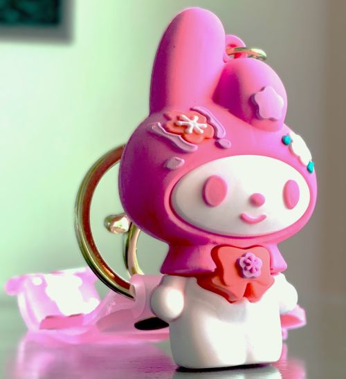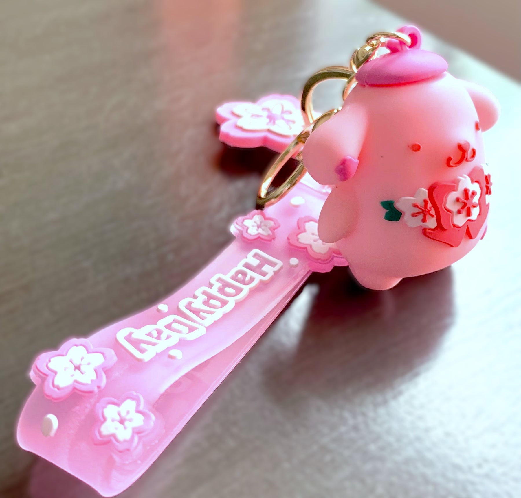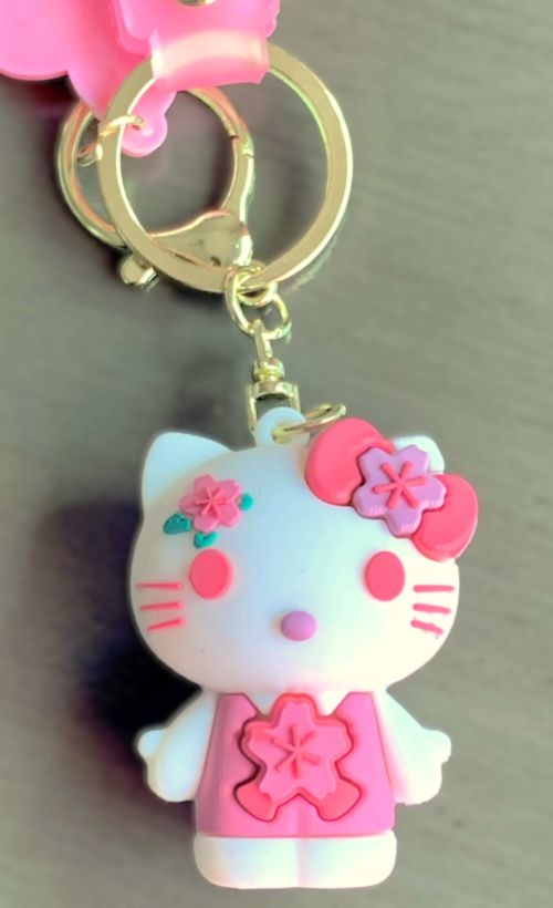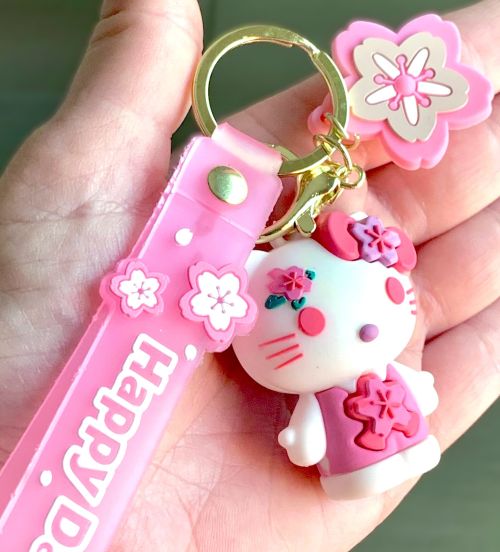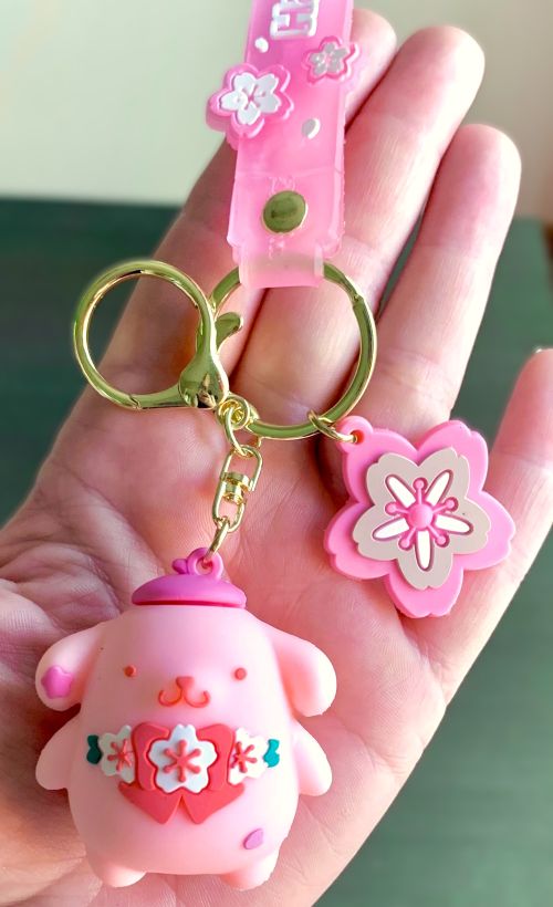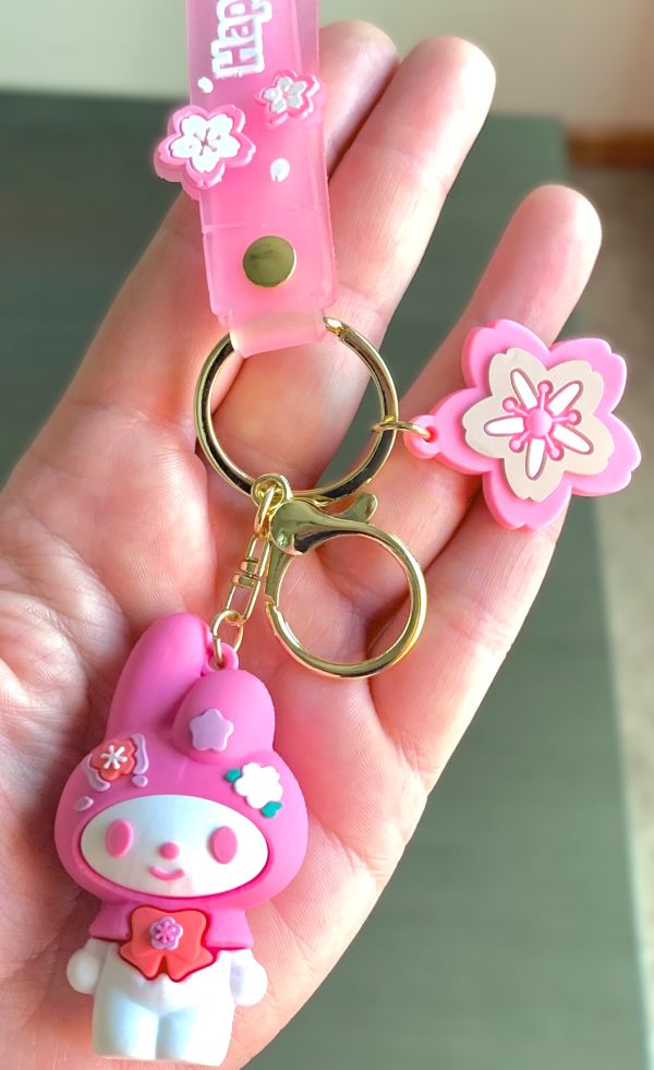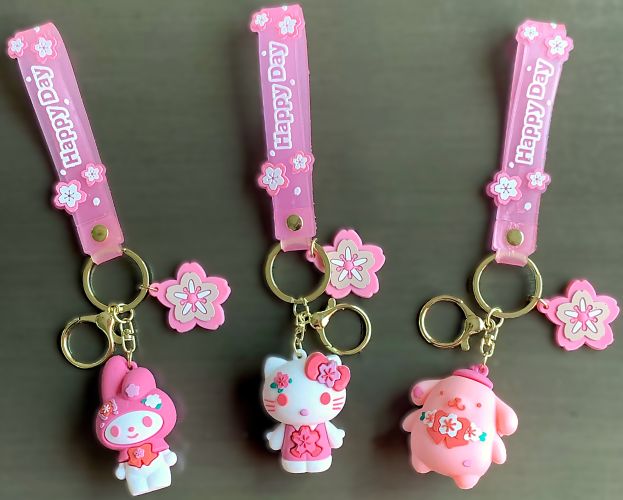 This collection features Hello Kitty & Friends with a cherry blossom theme. These are cute keychain/bag charms with a wrist strap that you can carry by or put around your wrist (for smaller wrists - approx. 2 1/2" diameter with length of 4"). Each features a 3D figurine of either My Melody, Hello Kitty or Pompompurin. The figurines are made of solid PVC. Each wristlet has two dangling soft PVC charms. Gold tone keychain and lobster clasp with large opening to hang on to lots of things.