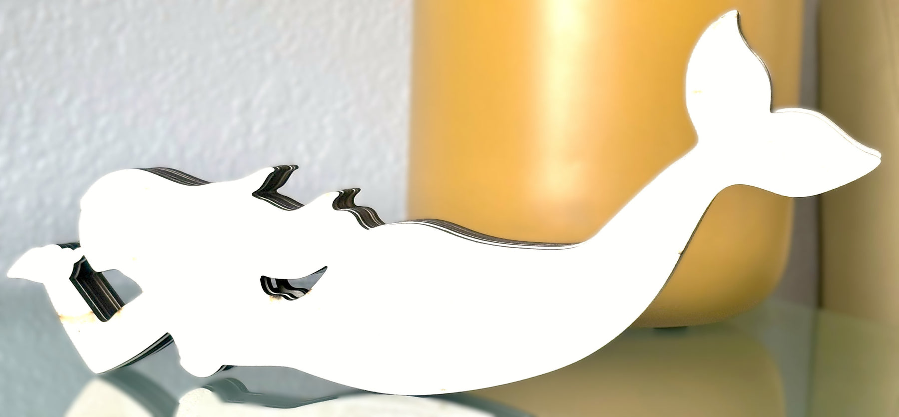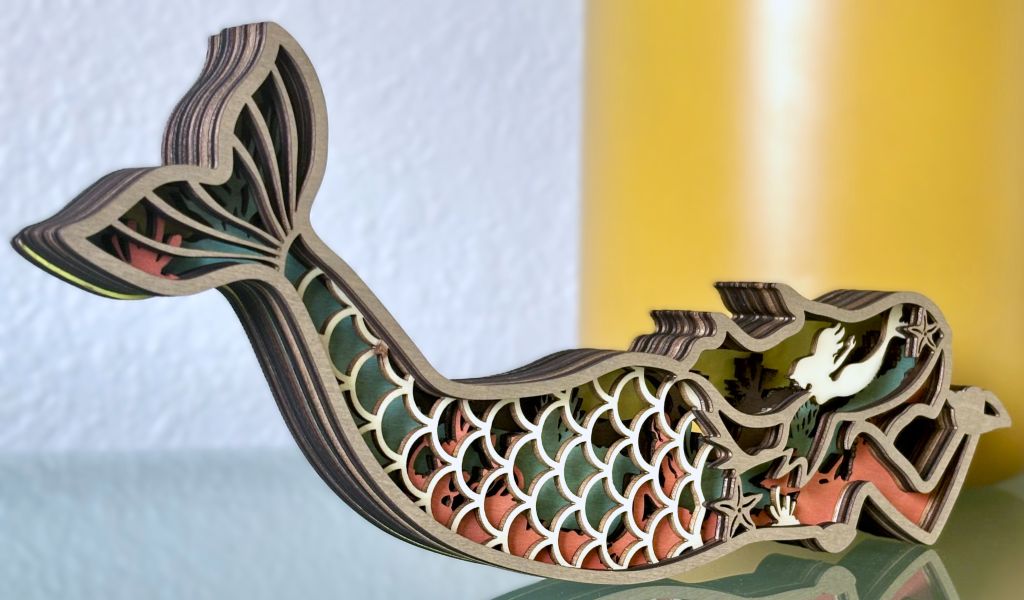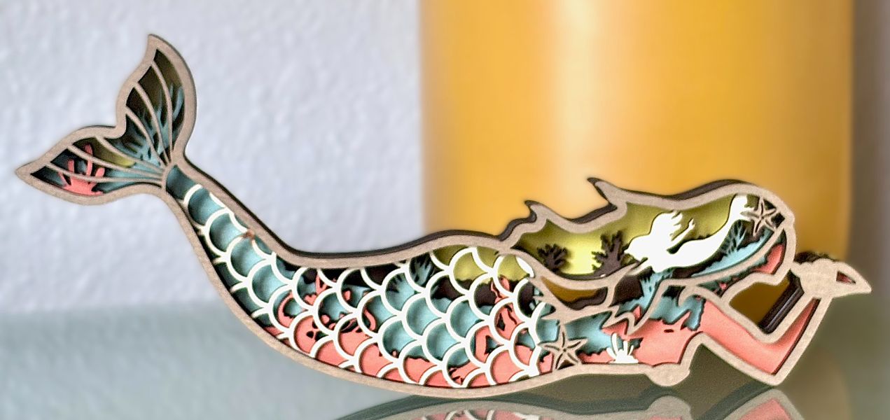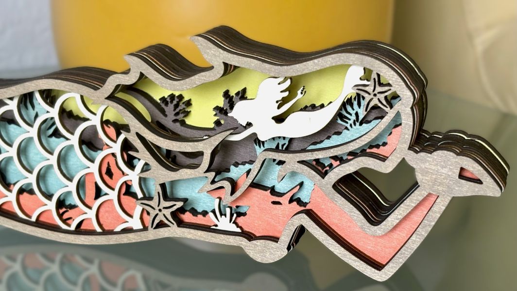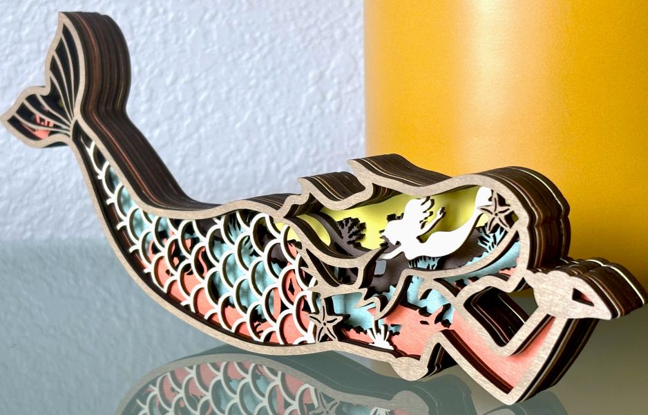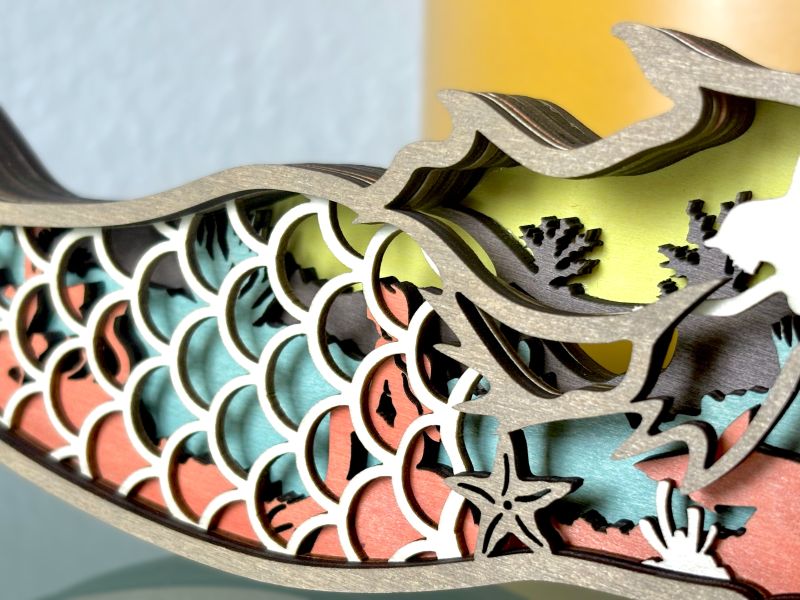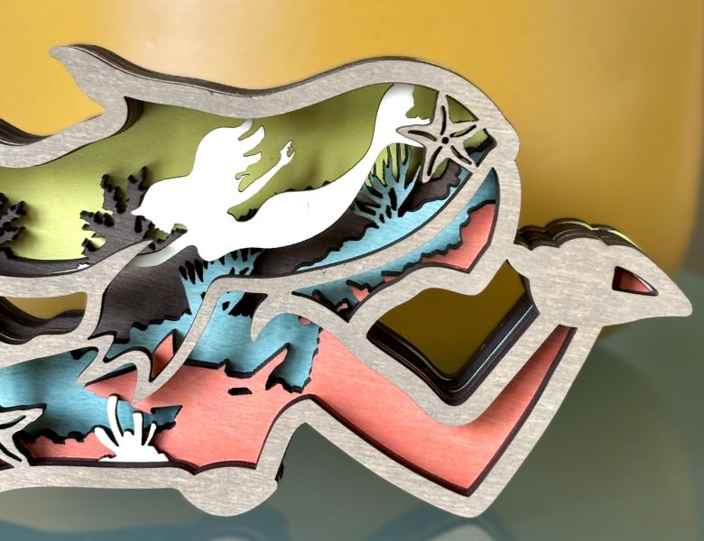 The splashy color palette of coral, light teal, and bright greenish-yellow pops against natural wood elements, creating a lively oceanic tableau. The mermaid silhouette features a light taupe exterior with a natural wood backing.