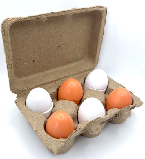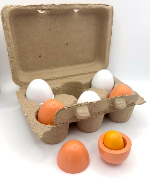 Durable and realistic, this set of six wooden eggs is perfect for little ones who love to play house and make-believe. The set includes both white and brown eggs that can be "cracked" into separate pieces - the two shells and a separate oblong yolk, making it a fun and educational toy for children to learn about food and cooking.