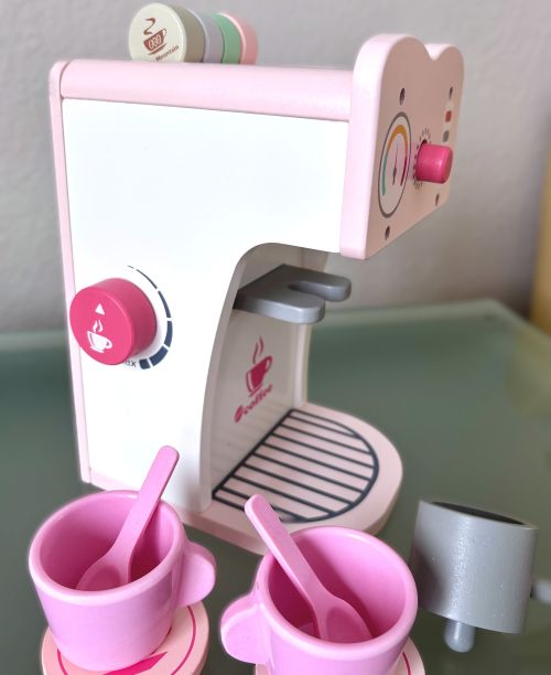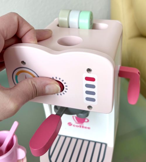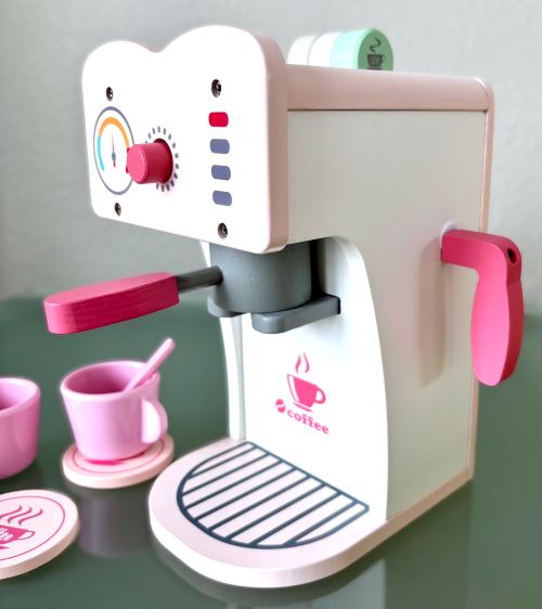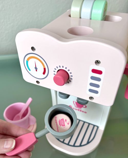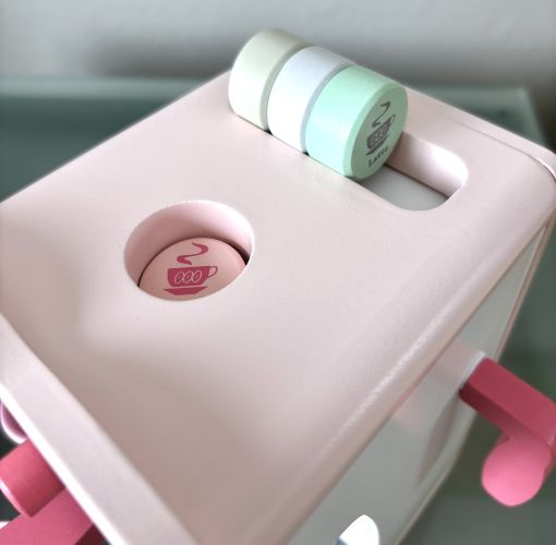 By placing a coffee chip in the top hole and pushing the pink button on the front, children can simulate brewing coffee. With this set, children can develop their motor skills and unleash their creativity while learning about the world of coffee. This educational set helps children with hand-eye coordination and logical thinking. This wooden playset also allows for a fun and engaging experience through imaginative and creative role-playing.