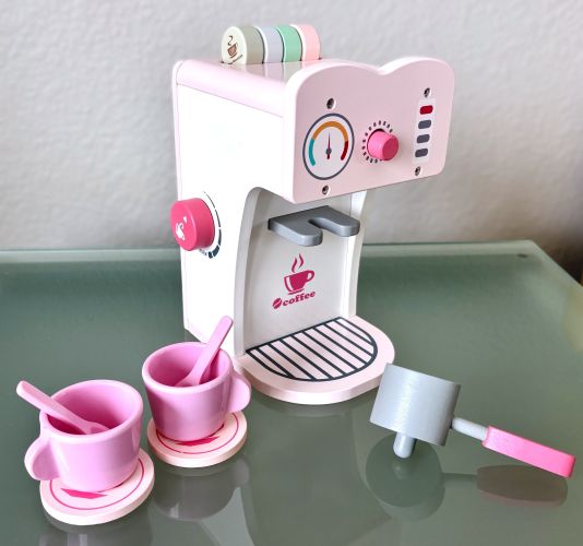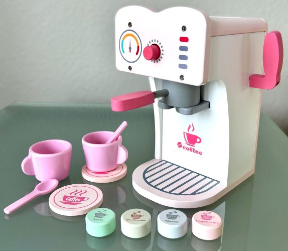 Constructed from durable, solid wood, this pink espresso machine playset sparks imaginative and educational play and introduces children to new experiences. This is a great set featuring a removable portafilter, four labeled coffee chips, two sturdy plastic cups and spoons, and two decorated wooden saucers for serving.