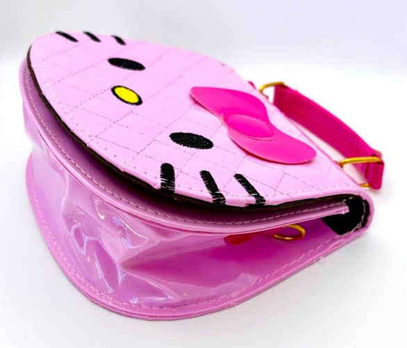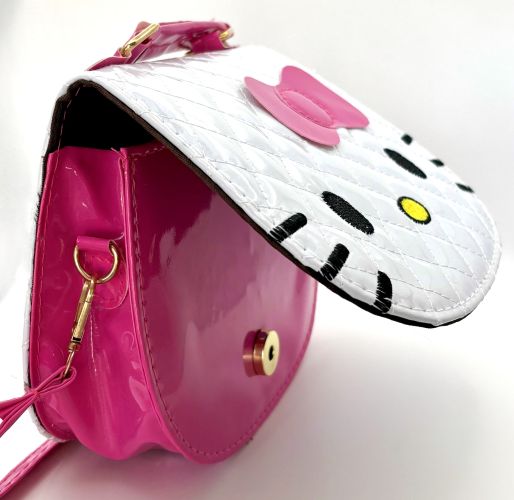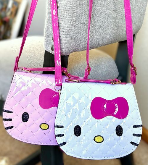 This Hello Kitty purse is great for children or teens that are into Kawaii and Hello Kitty & Friends! It is available in two-tone of white and fuchsia and bubblegum pink with a fuchsia bow. It has a shiny vinyl body with 'quilted' detailing. Kitty's bow is made of vinyl and her face is embroidered on. The back is embroidered with 'Hello Kitty' written in cursive. This darling crossbody bag can turn into a handbag which is carried by the strap on top. The crossbody strap is completely removeable and adjustable. The strap drop adjusts from 10" long to 19" long.
