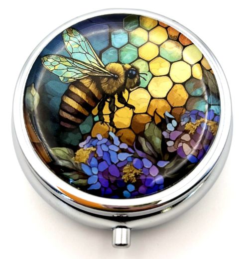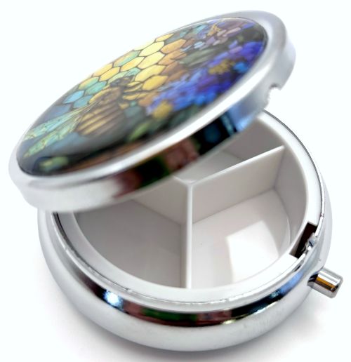 This pill box features a wonderfully designed image of a bee with vibrant blue and purple flowers with honeycomb in the background. Such a pretty color scheme!