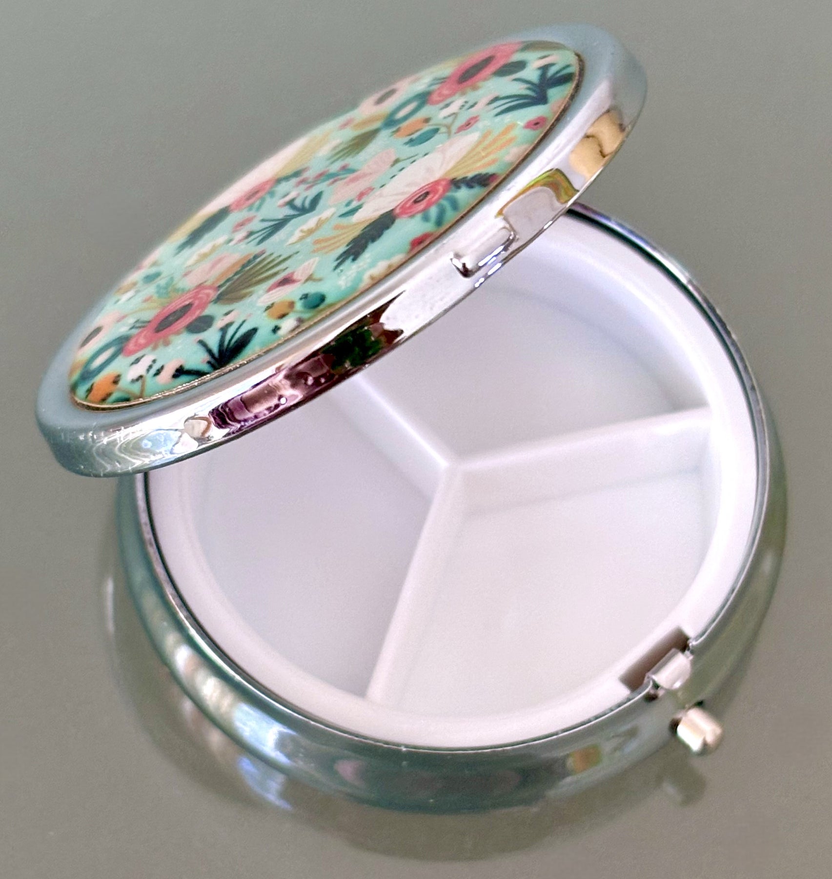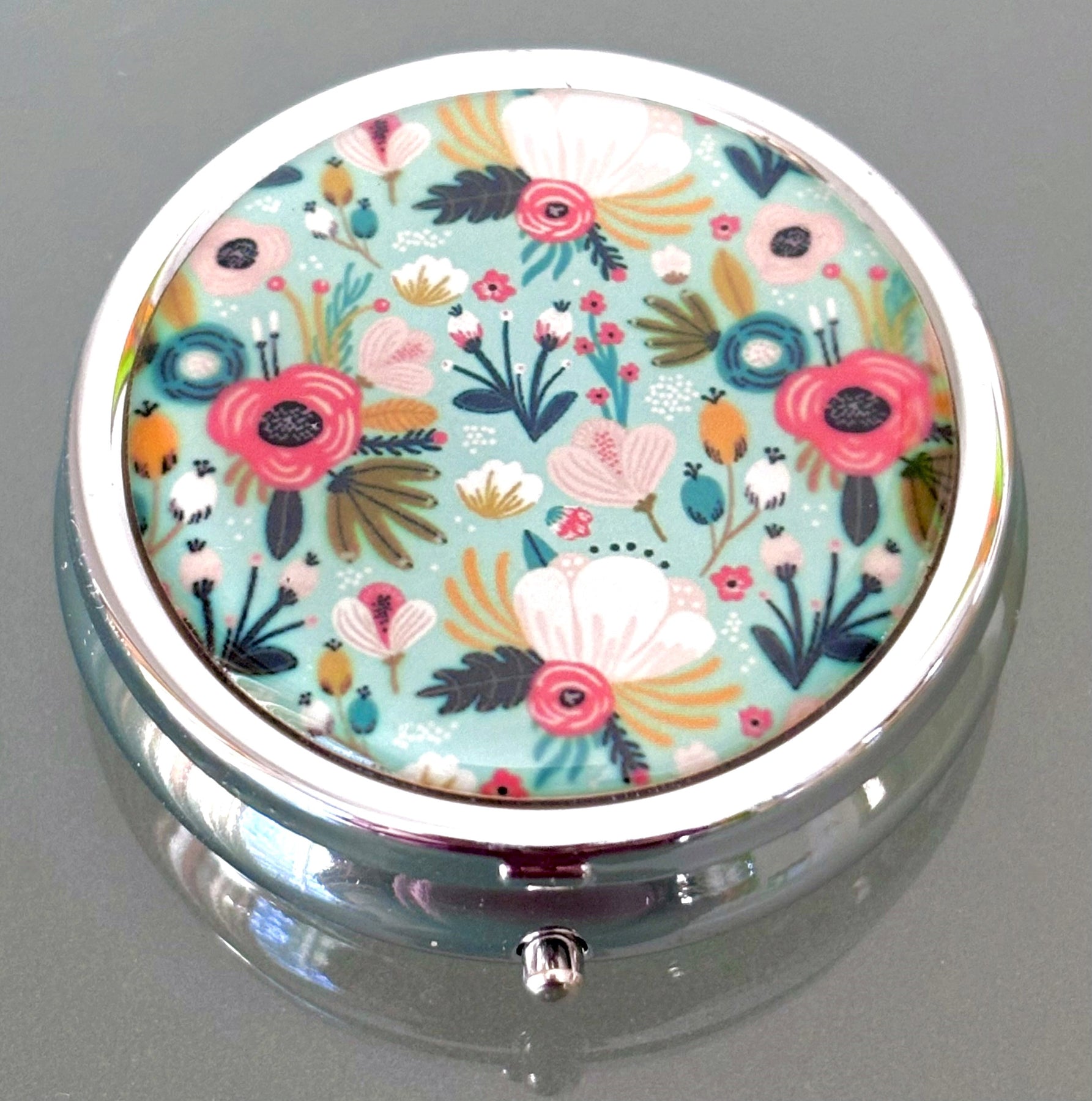 This pill box features a fun, whimsical flower design. Great color scheme!