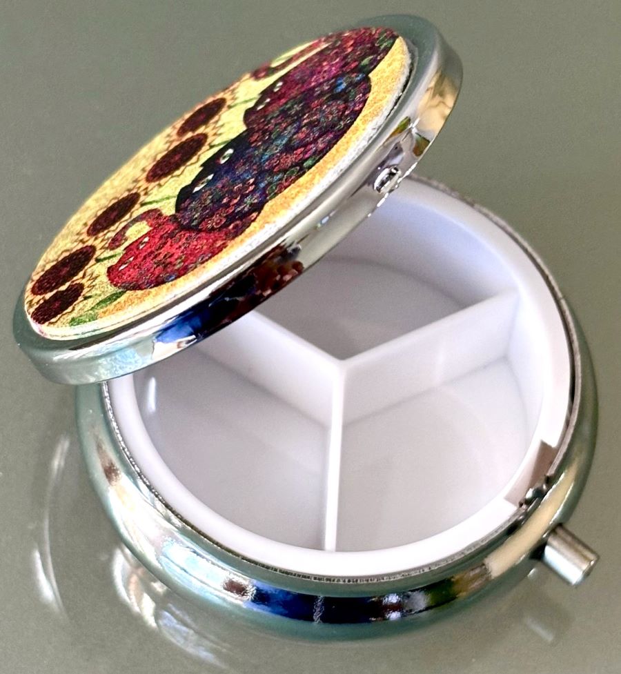 These are designed so nicely and are very handy to have. Small decorative pill boxes to keep in your purse or pocket...great for travel or overnights! No more needing to tote around prescription bottles or count out the right amount of pills, vitamins, etc. to put in a sandwich bag! Decorative and discreet. These could also hold a variety of small items that could easily be lost.