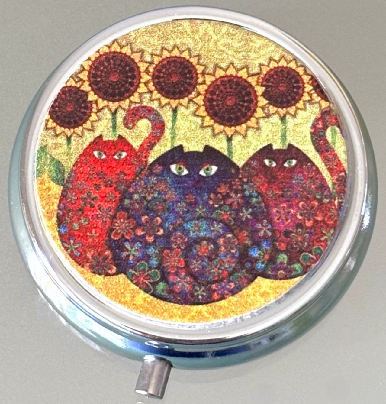 This pill box features a fun design with whimsical Boho flair! Three round cats featuring floral patterns are accented with sunflowers.