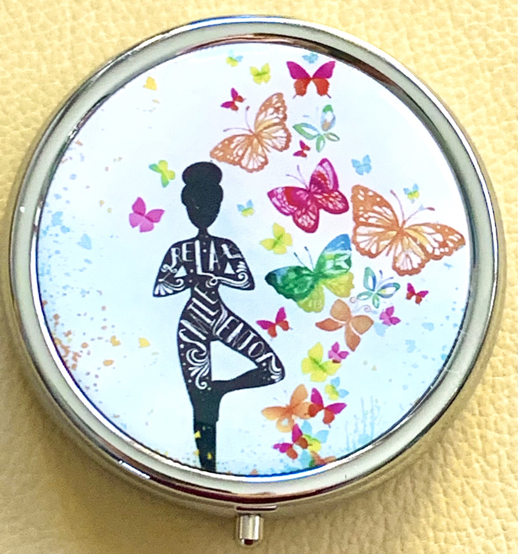 These pill boxes are high-quality with a stainless steel body and a colorful, decorative image on the lid. Image is protected by a clear lacquer-type coating.