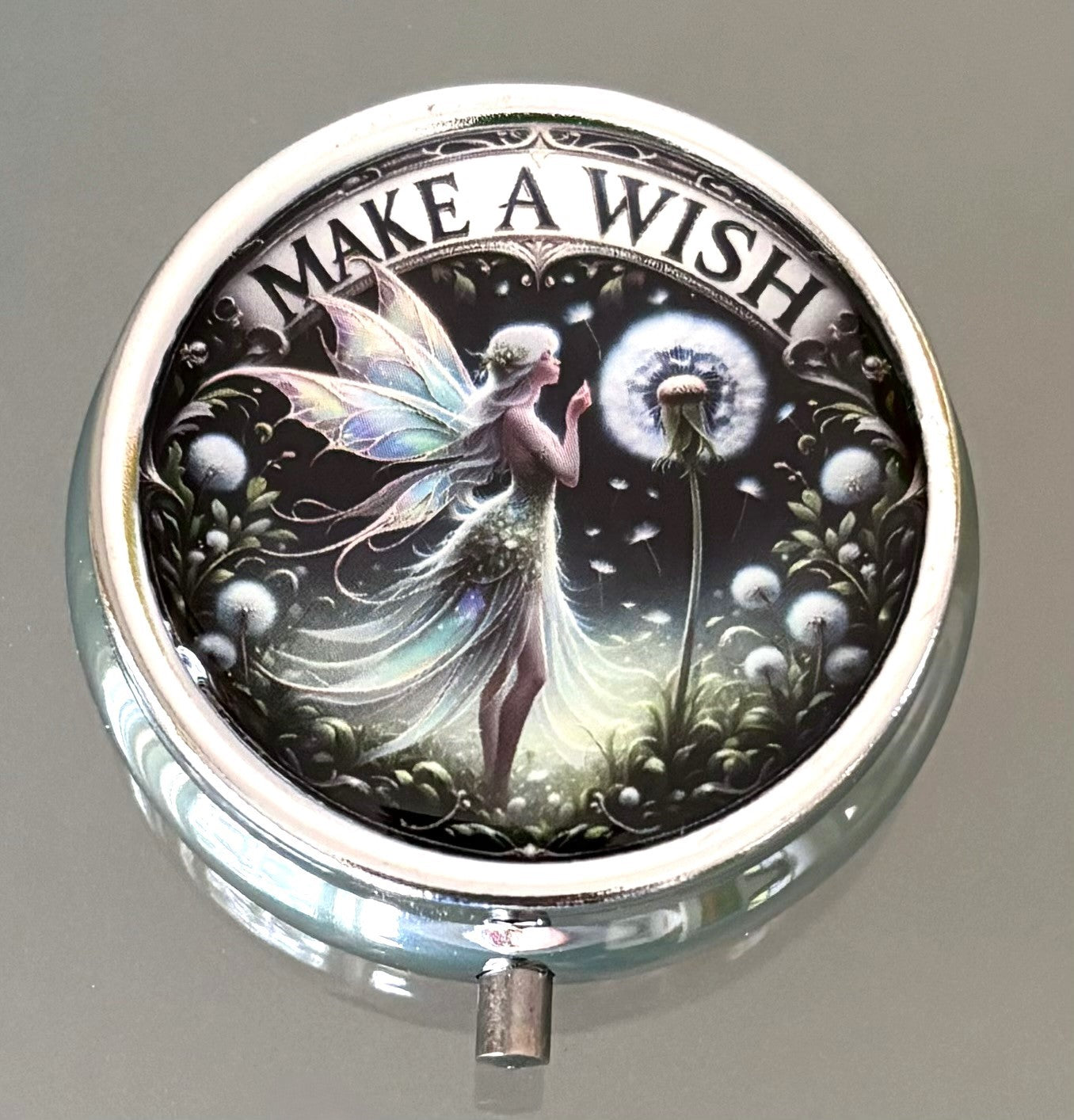 This pill box is magical with a beautiful fairy blowing a very large dandelion puff and the words "Make a Wish" at the top.