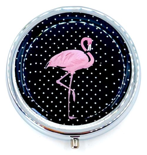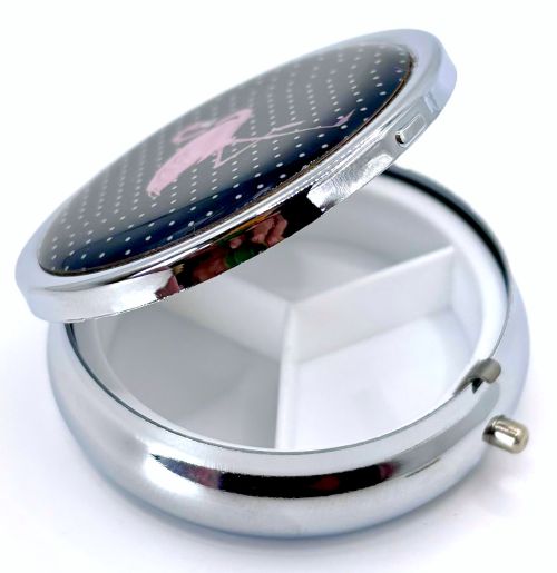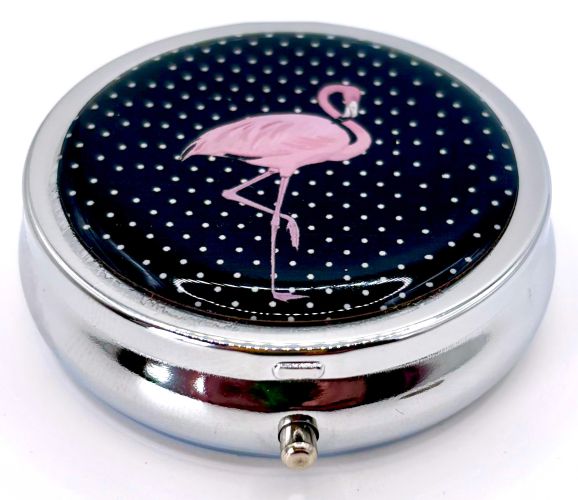 These pill boxes are high-quality with a stainless steel body and a colorful, decorative image on the lid. Image is protected by a clear lacquer-type coating.