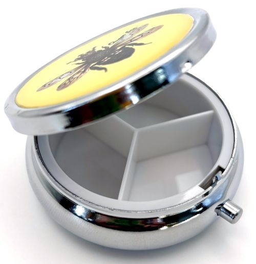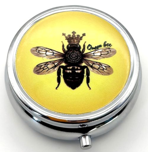 This pill box features a bee wearing an ornate crown and reads "Queen Bee" above the top right wing. The background is a very pretty vibrant yellow with a slight gradation around the outside.
