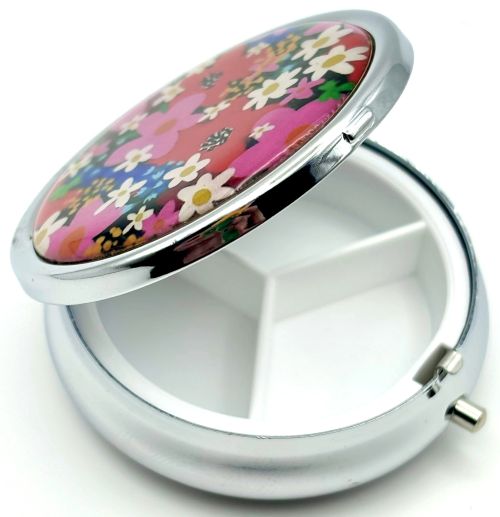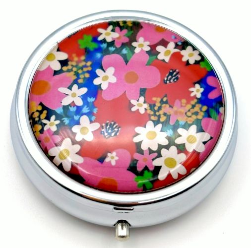 This pill box features a cheery and whimsical floral design. Vibrant colors of pink, red, white, blue, purple...!