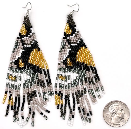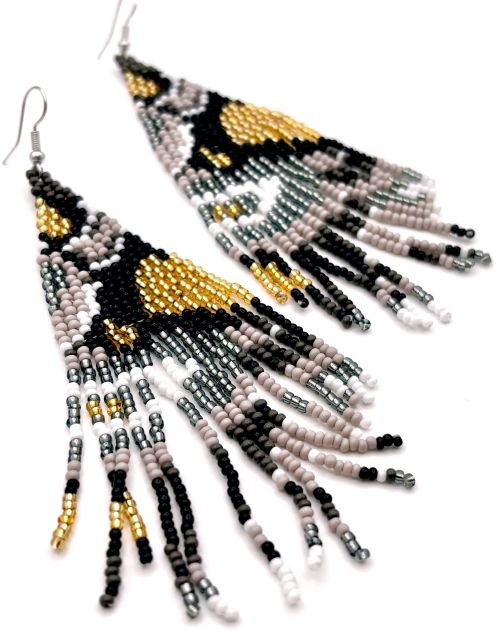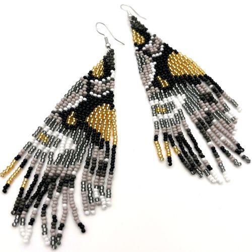 Introducing our stunning hand beaded tassel earrings in an elegant blend of black, gold, silver, gray, and white. These colors combine to make the unique design that is reminiscent of an abstract animal print. Handcrafted with love and care, each pair is uniquely designed to showcase the beauty of artisanal craftsmanship.