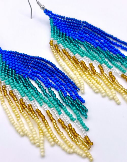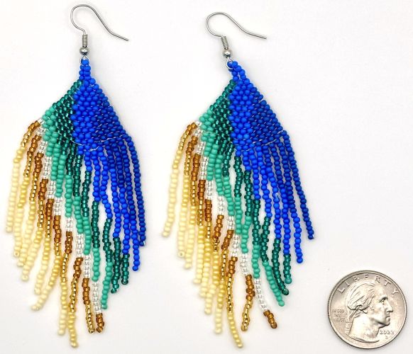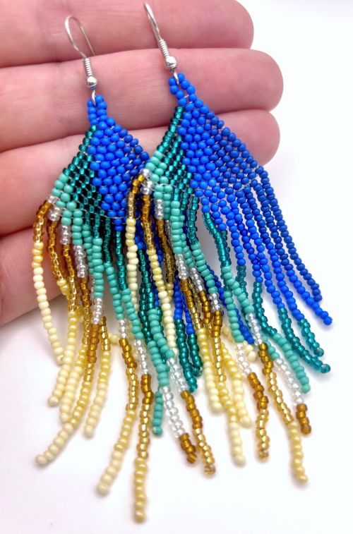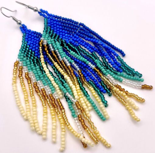These are beautiful hand beaded tassel earrings in a unique color gradient that goes from cool to warm colors. Seven colors of glass seed beads are used in the creation of these gorgeous earrings, which are quite versatile and can be dressed up or down! Navy blue, royal blue, metallic green, matte sage green, metallic silver, metallic copper, metallic gold, and matte cream are the color of beads used in these earrings which feature fifteen tassels. Handcrafted with love and care, each pair is uniquely made, ensuring that you stand out from the crowd.
