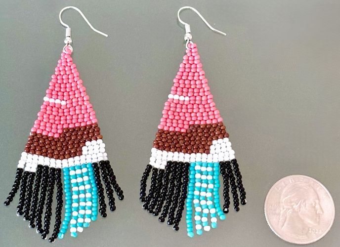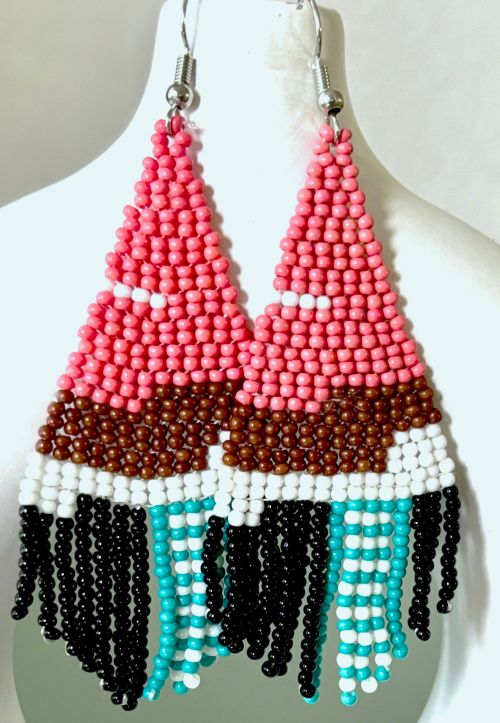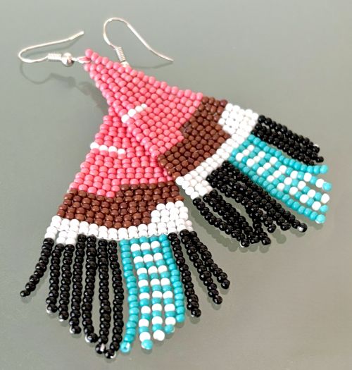Introducing our stunning hand beaded contemporary color block earrings. These earrings feature a unique and contemporary color block design. The unique and eye-catching color combination features five colors including a gorgeous warm pink, brown, white, black, and turquoise. Exquisitely handcrafted.