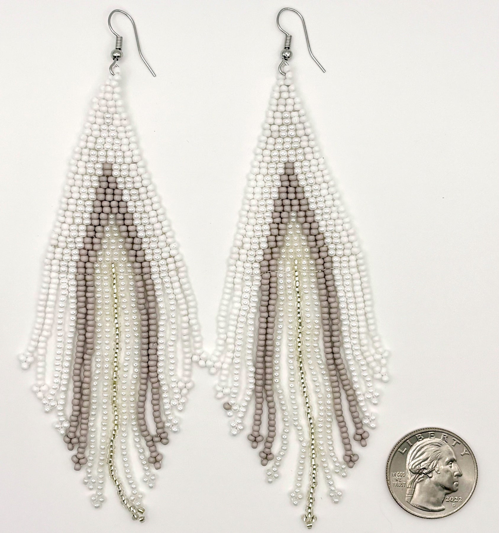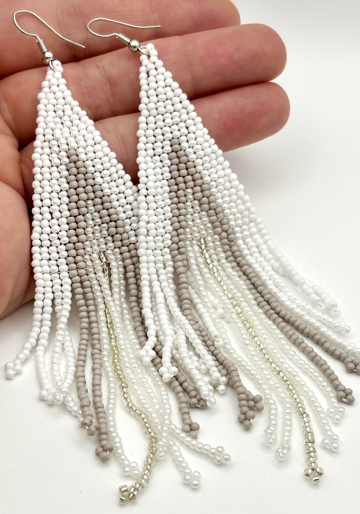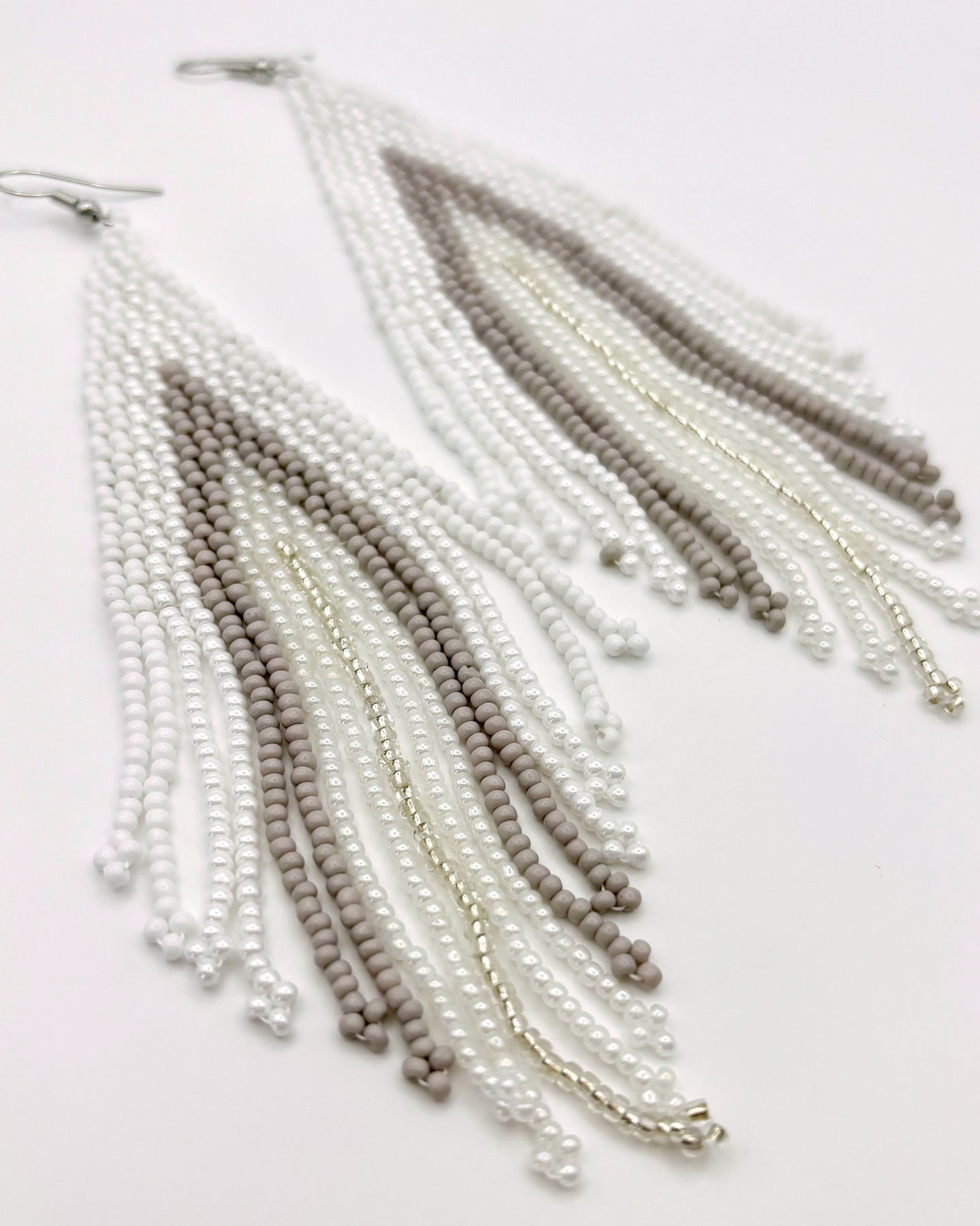 Each pair is meticulously hand beaded with care, ensuring that every detail shines through. There are five colors of glass seed beads used in these earrings. First is pure white, followed by a shiny white that catches the light, a very light warm-tone gray, a shiny clear and ending with a single tassel of sparkly metallic silver. The tassel design adds a playful movement, making them perfect for dancing the night away or simply swaying with your every step. These earrings are a very comfortable weight, designed for all-day wear.