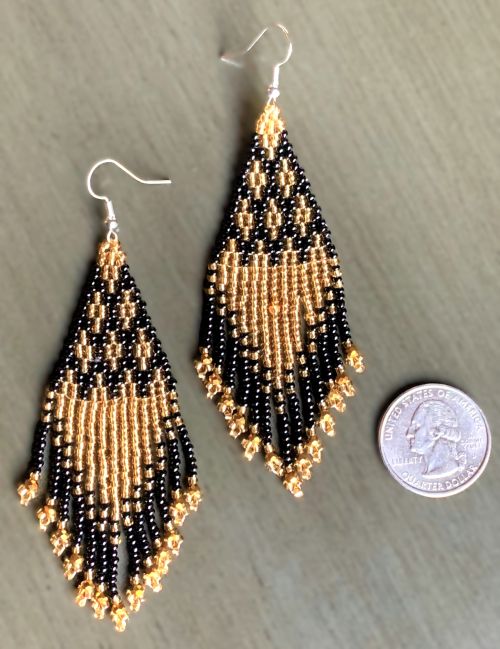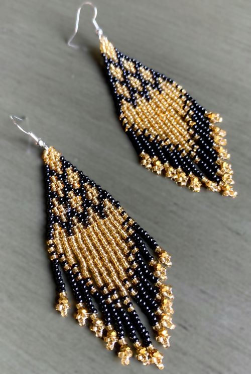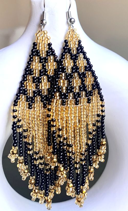 Introducing our stunning hand beaded tassel earrings in an elegant black and gold color scheme. They are definitely elegant enough to wear on date night with a snazzy little dress! These earrings are the perfect accessory for anyone looking to add a touch of Bohemian elegance to their outfit. The glass seed beads used to make these earrings include shiny black and metallic gold. Handcrafted with love and care, each pair is uniquely made, ensuring that you stand out from the crowd.